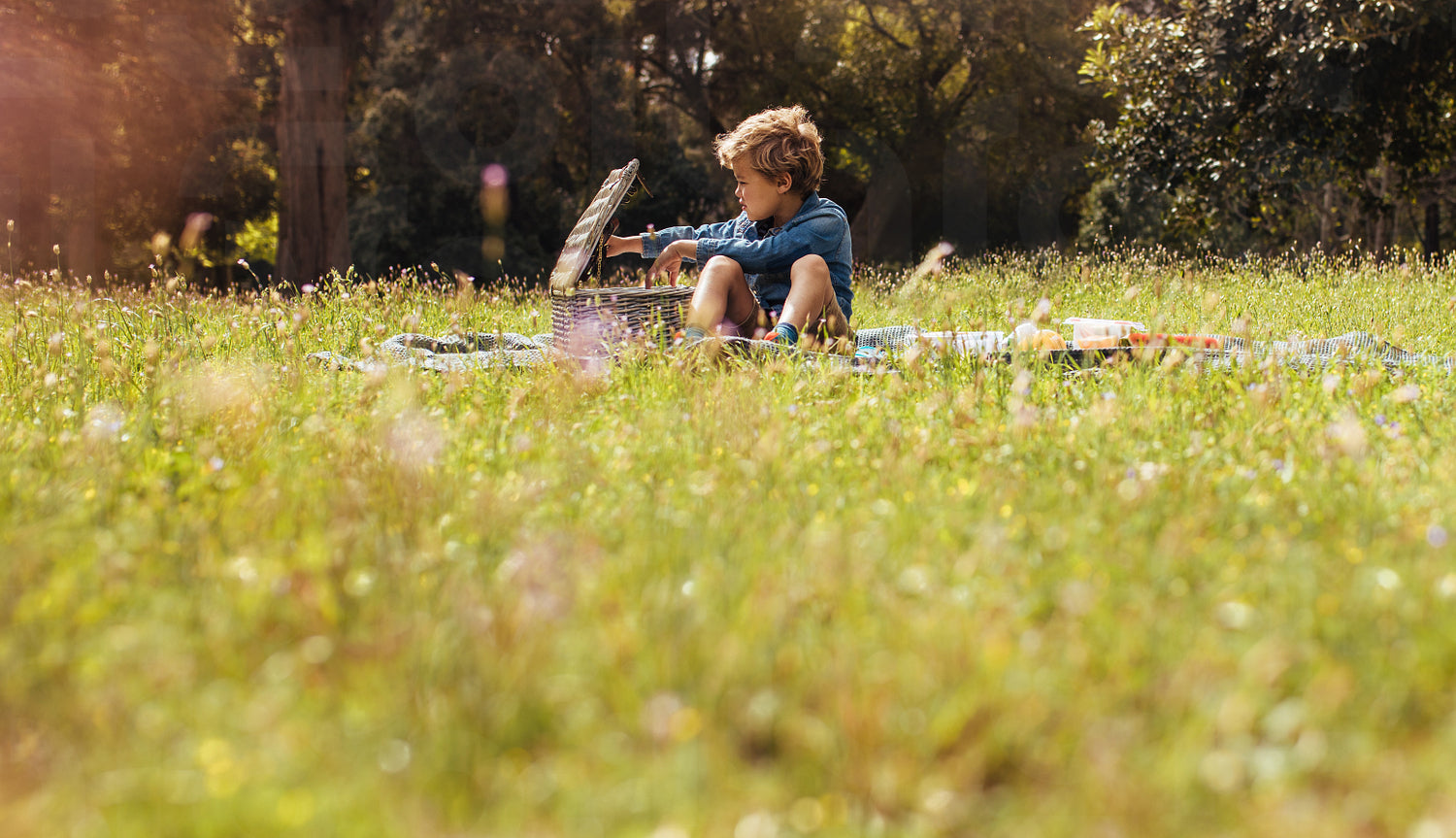 Little boy in the sitting at the park and looking inside the picnic basket. Small boy with basket on a picnic in the garden.