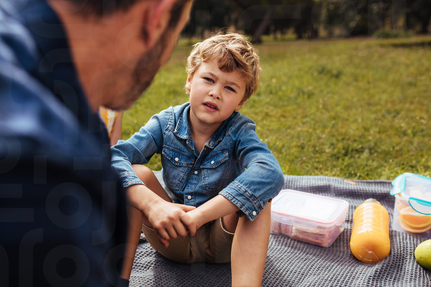 Cute little boy talking with his father while sitting on picnic blanket with food on the side. Son having conversation with his dad at picnic.