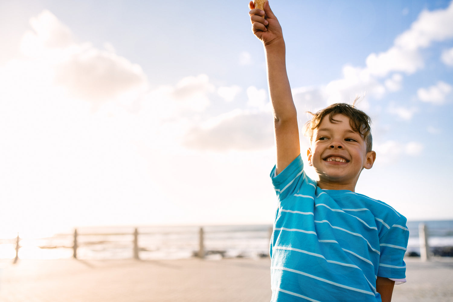 Boy holding an ice cream standing at seafront. Cheerful boy holding an ice cream with raised hand.