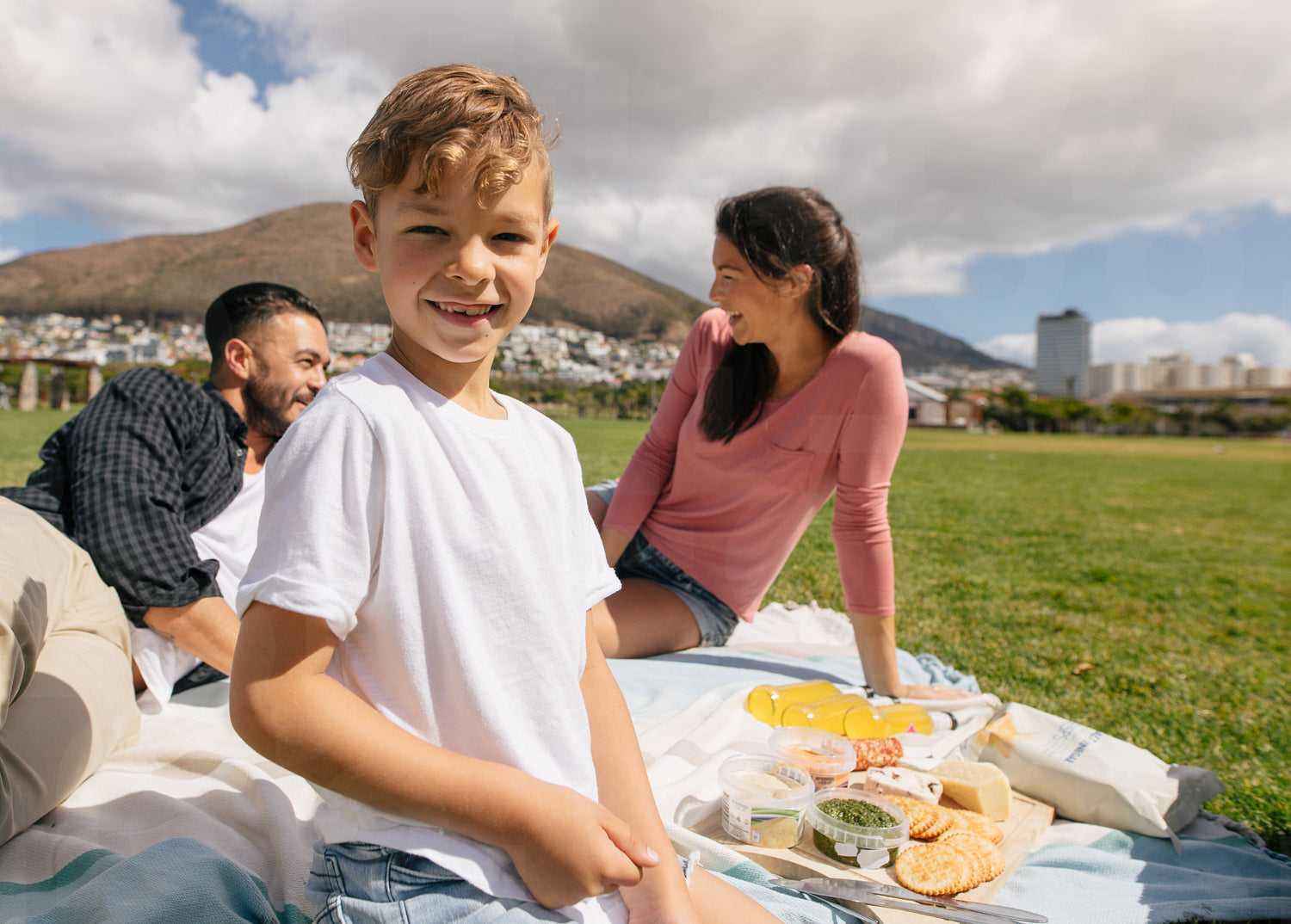 Cheerful couple with their child having a day out. Family sitting in a park with snacks for picnic.