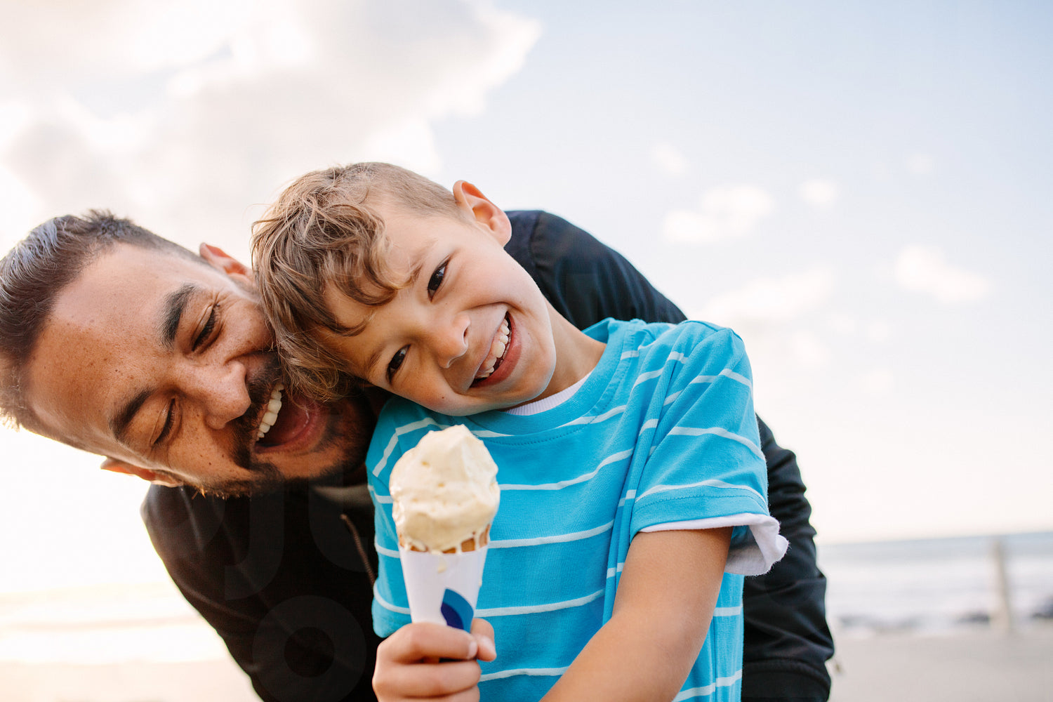 Boy eating an ice cream standing near seafront with his father. Little boy holding an ice cream cone while his father playfully tries to eat it from behind.