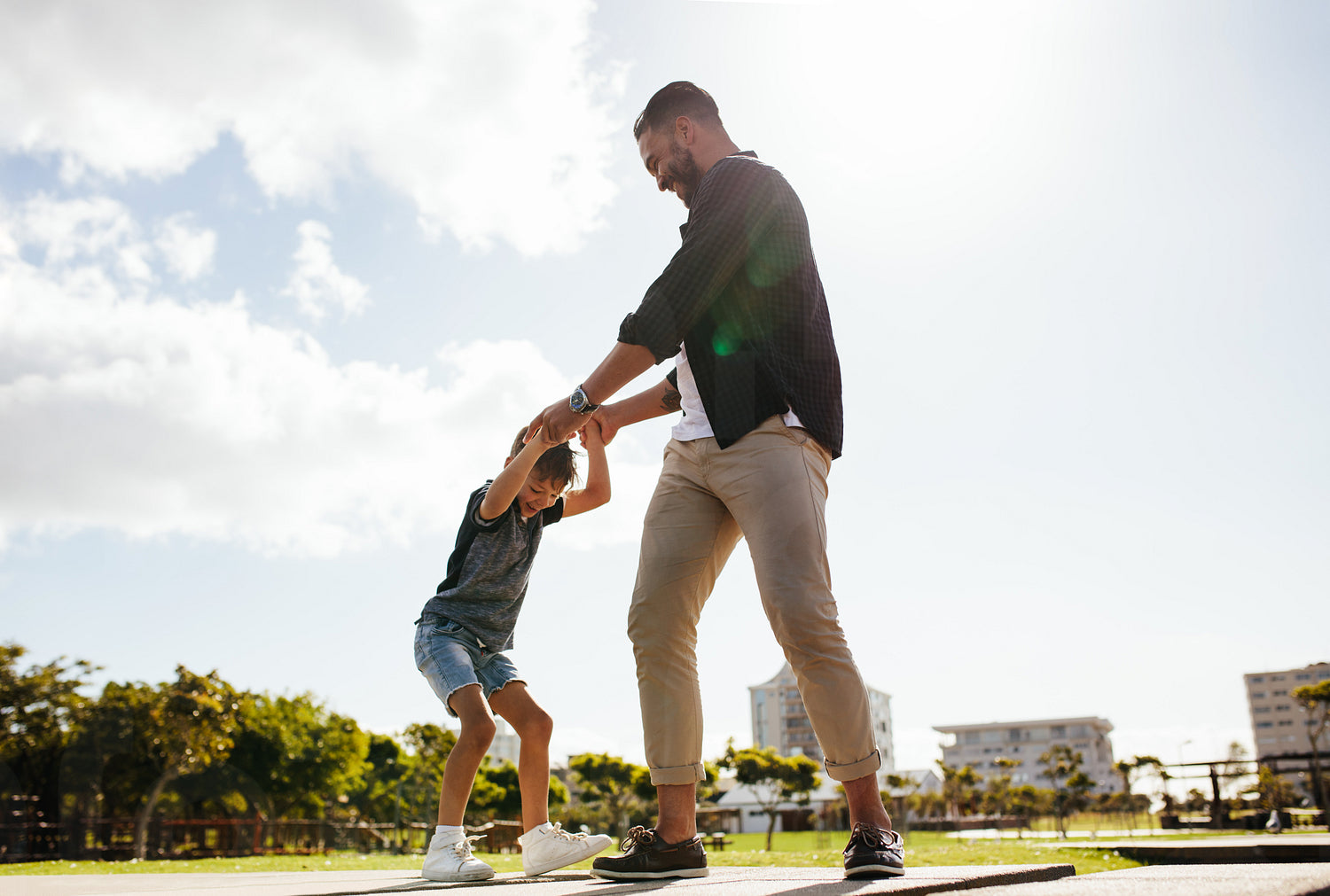 Cheerful man playing with his son at a park. Father holding hands of his child in playful mood outdoors.