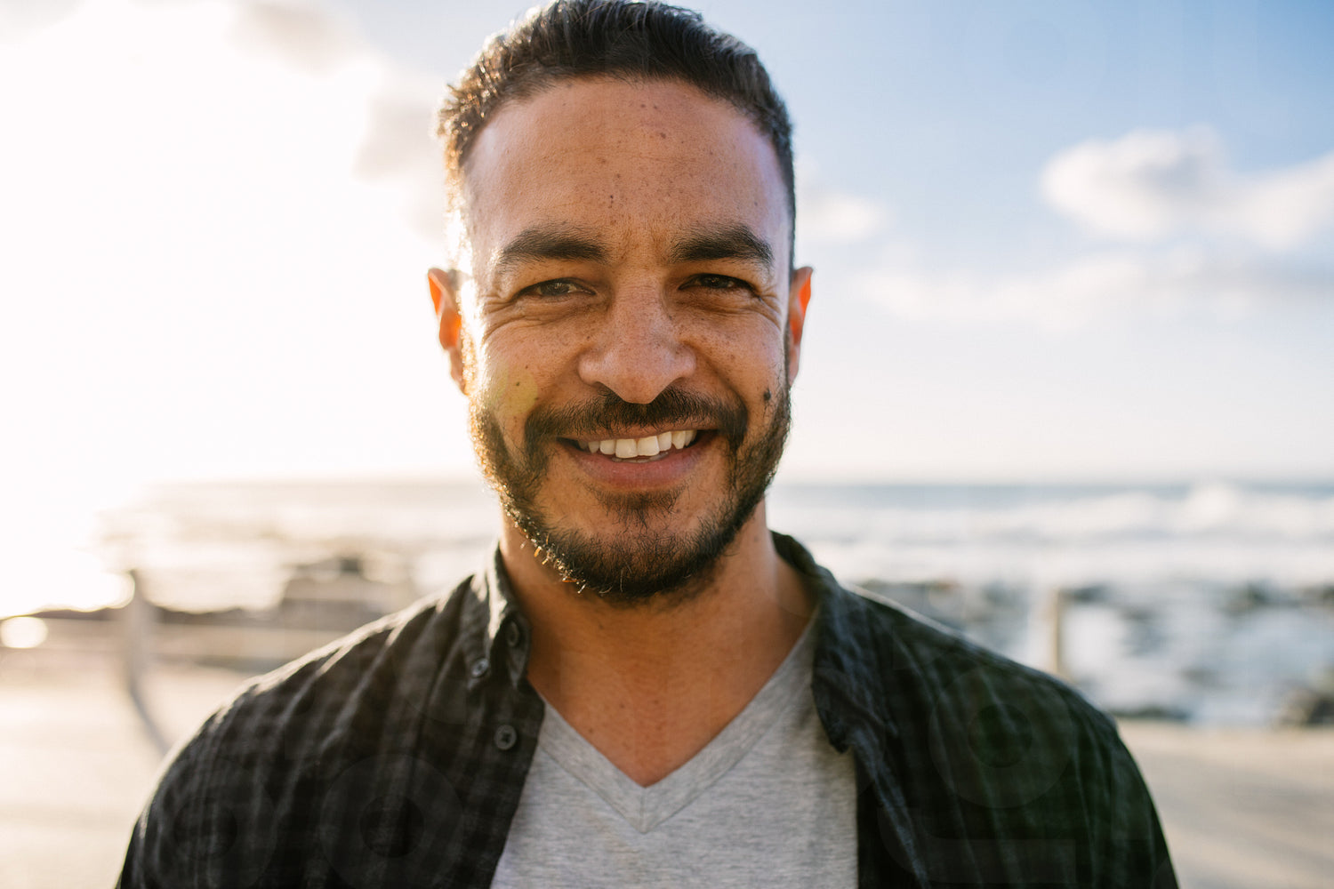 Close up of a man on vacation standing near the sea. Portrait of a smiling man holidaying.