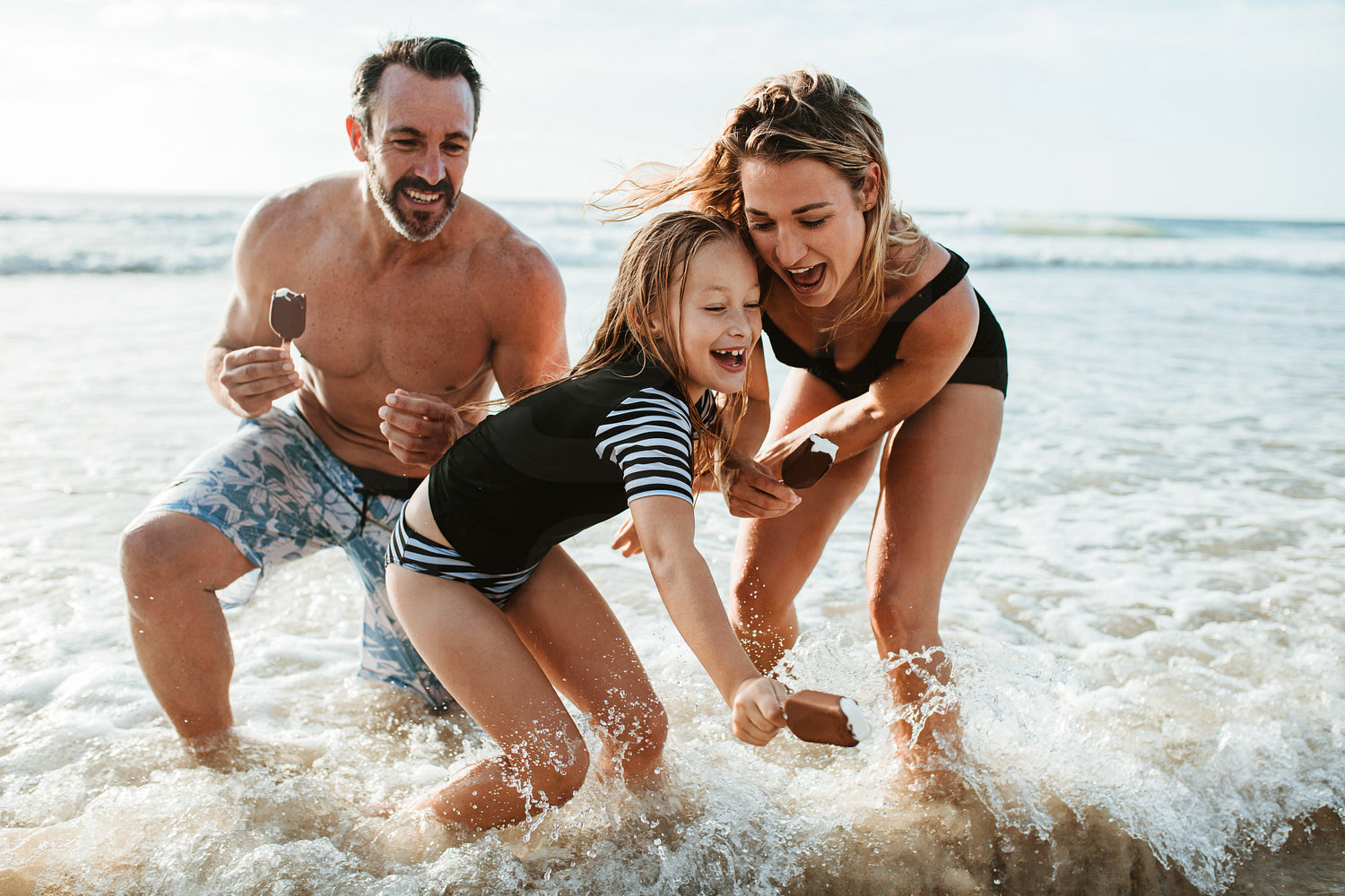 Family holding ice-cream candies and playing in sea water. Father, mother and daughter enjoying a summer weekend on the beach.