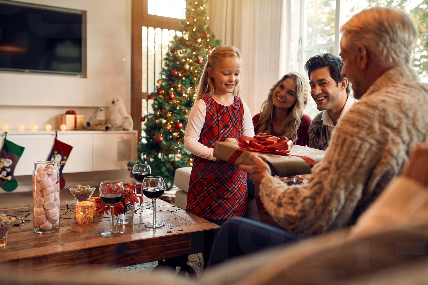 Cute little girl receiving a gift for christmas and new year from her grandfather. Family sitting in living room on christmas eve.