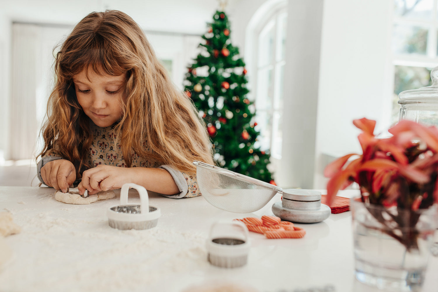 Happy little girl making Christmas cookies on kitchen table. Girl using moulds and shape cutters to make cookies.