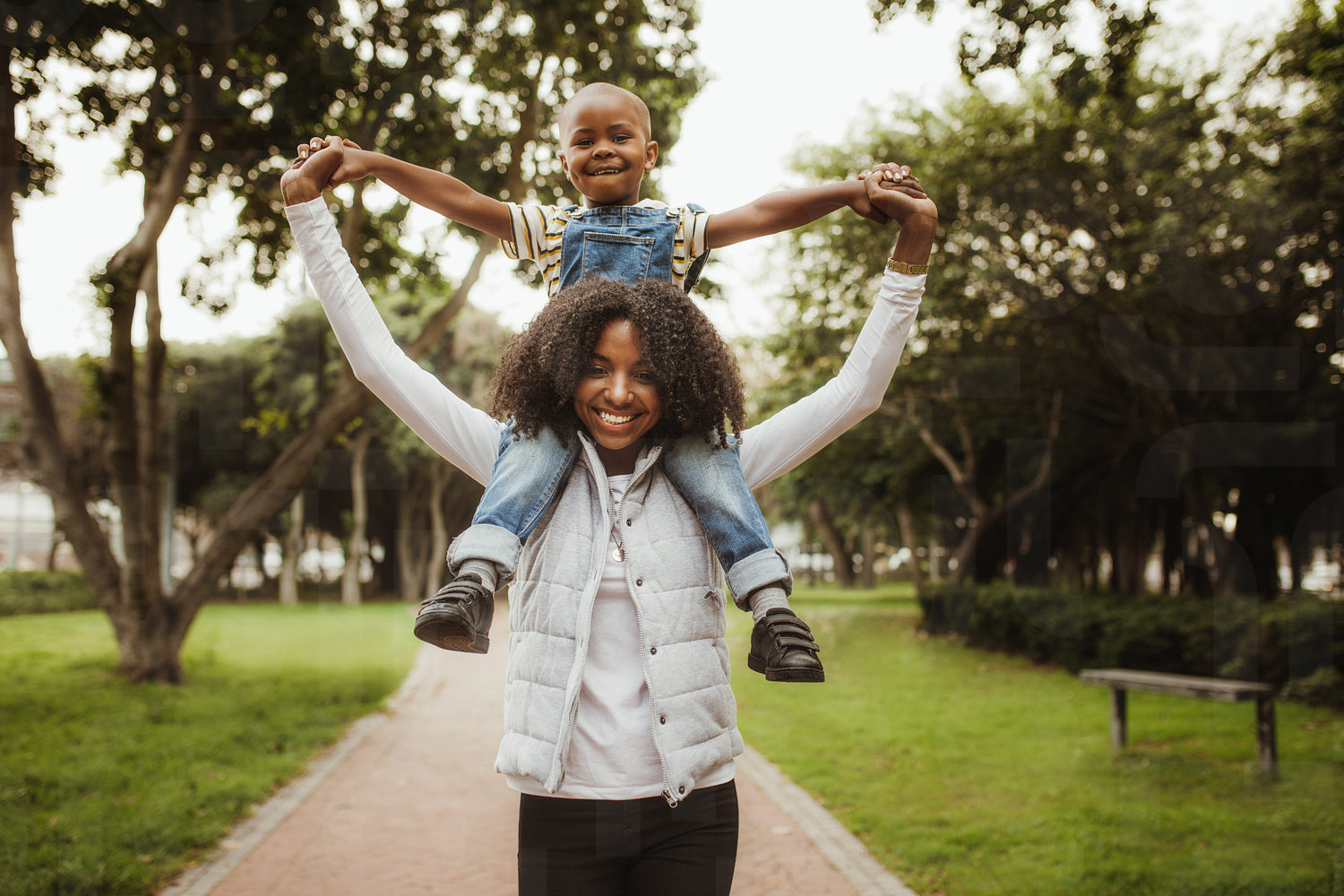 Happy mother giving son a piggyback ride on her shoulders in park. African woman carrying his boy on her shoulders while walking in a park.