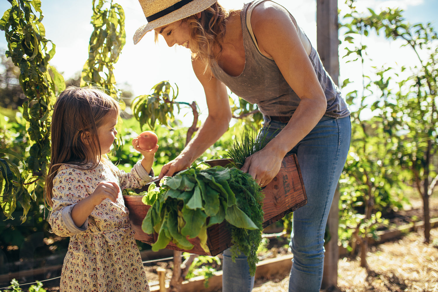 Little girl looking at fresh vegetables in tray of a her mother. Mother and daughter with freshly harvested vegetables in their garden.