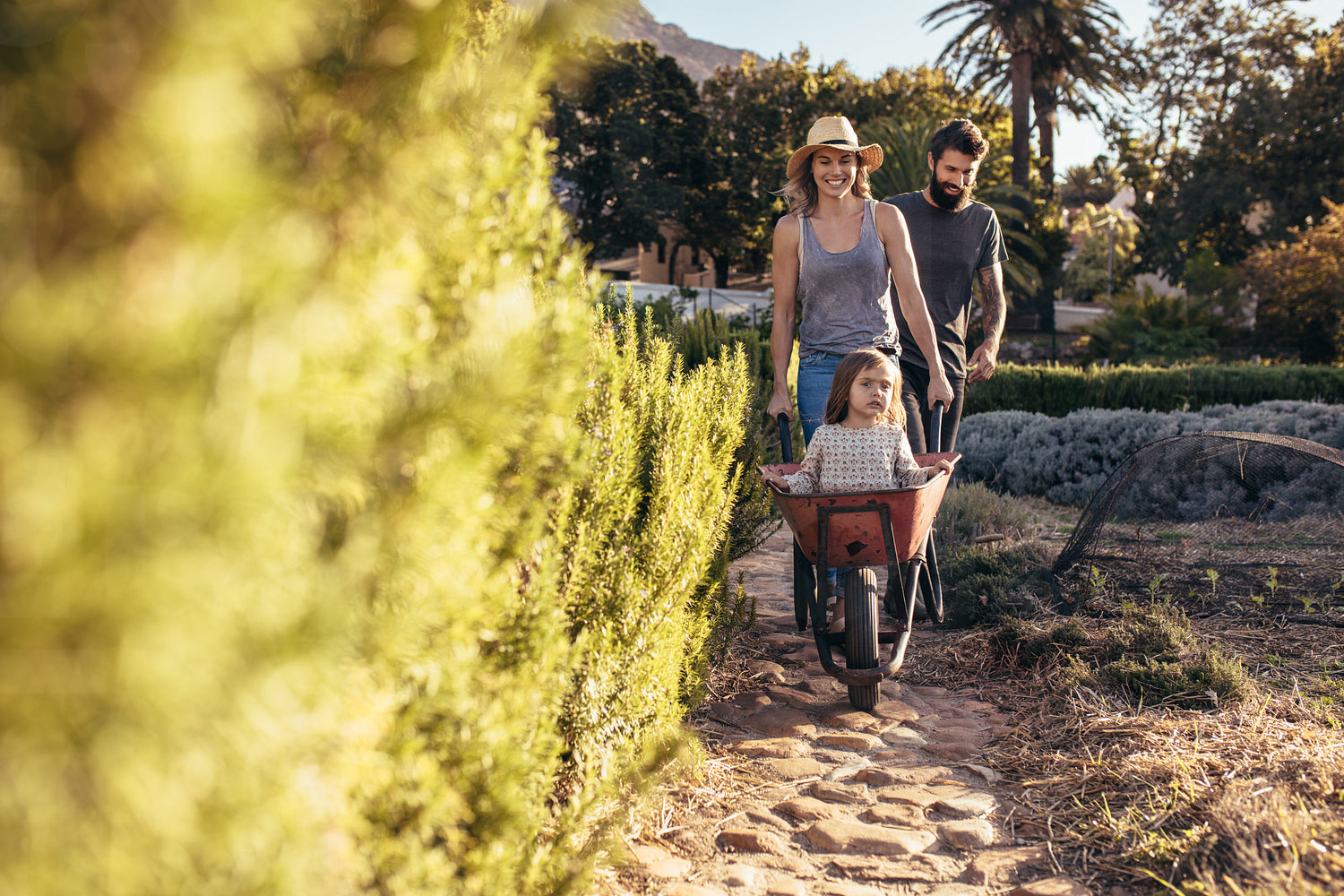 Woman pushing little girl on wheelbarrow with man walking behind. Young family enjoying in their farm.