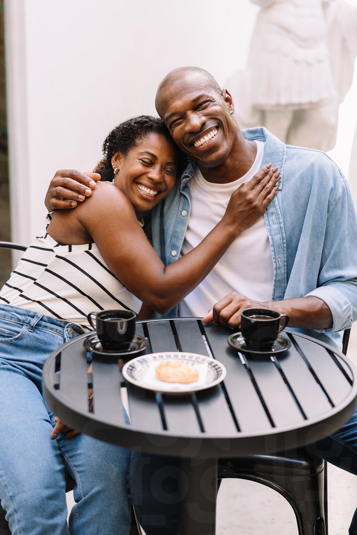 A joyful black couple sitting at a cafe table, smiling and hugging while enjoying coffee together. Their happiness and the fun atmosphere are infectious.