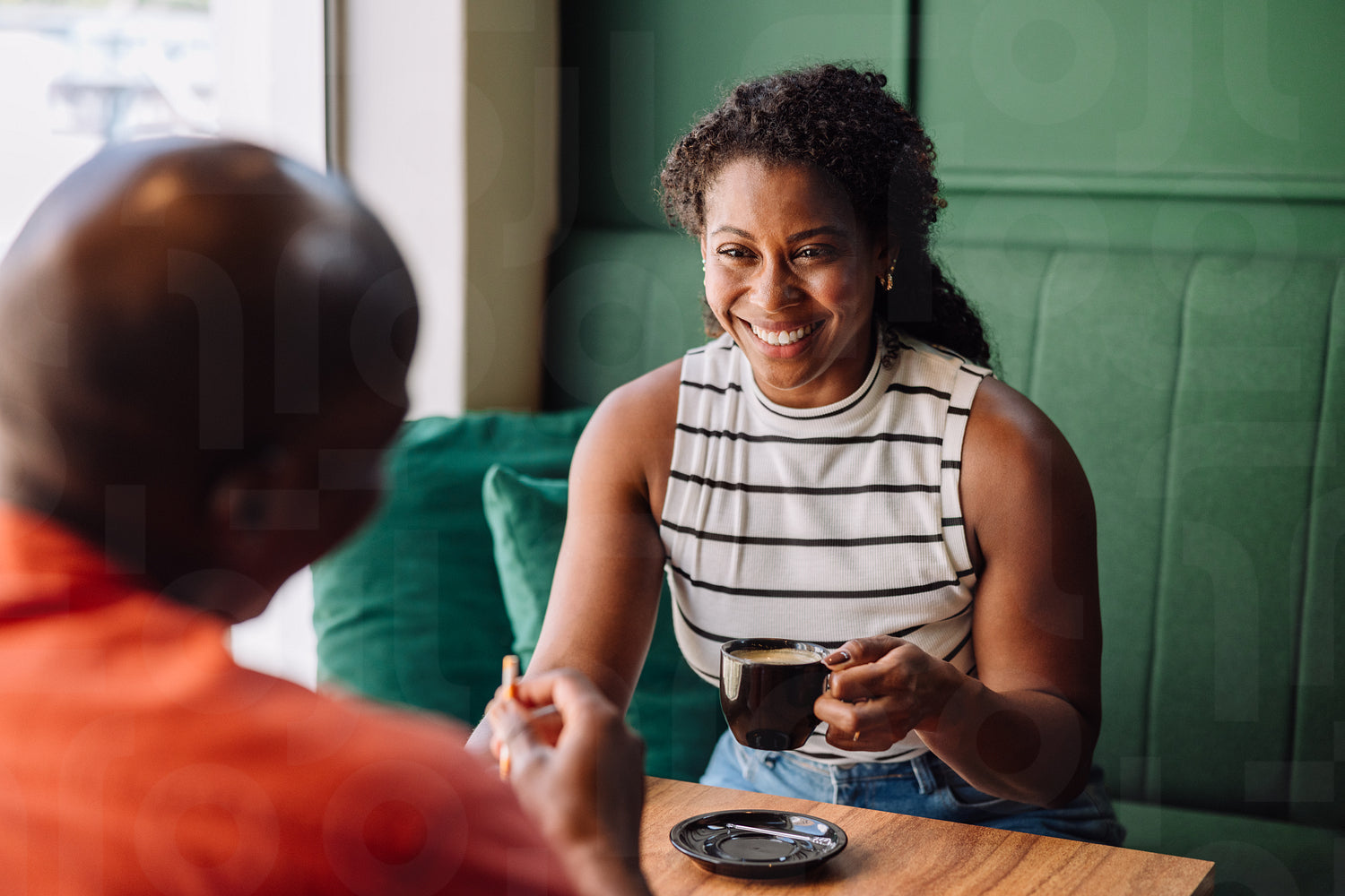 Happy black woman smiling broadly during a fun, casual coffee meet-up with a friend. Friends enjoying their conversation over coffee.