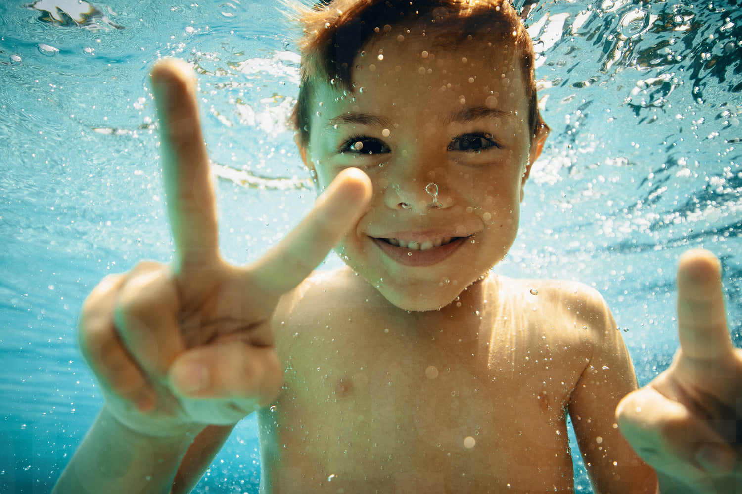 A cheerful young boy is having fun underwater, making a peace sign with his hands while swimming during a vacation. The playful atmosphere and bubbles add to the lively summer feeling.