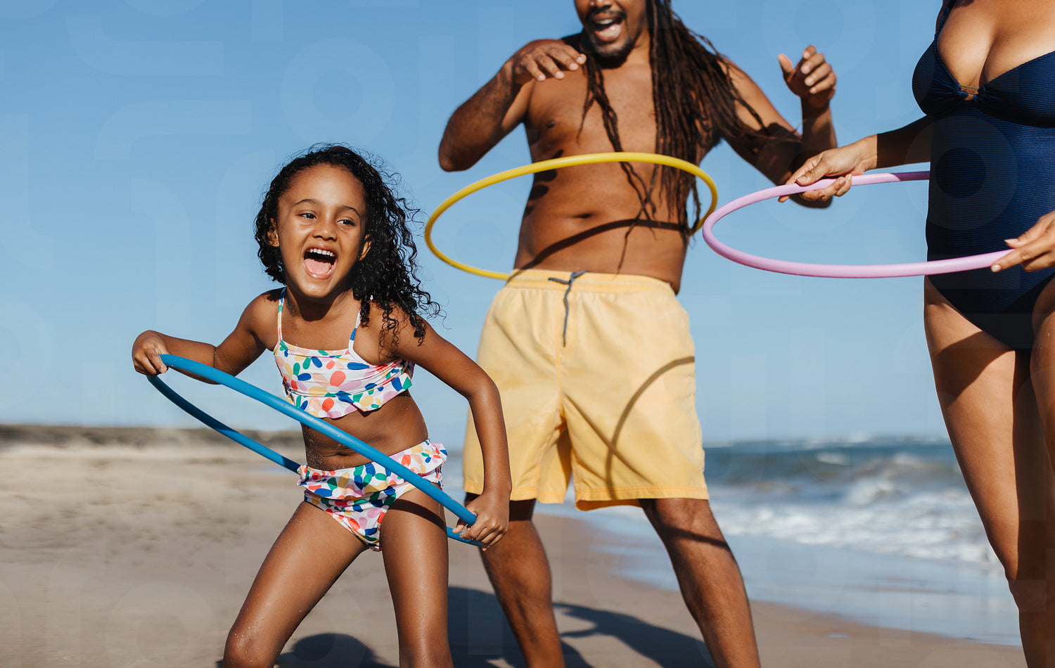 Happy girl playing with hula hoop at the beach alongside family, capturing fun and joy on a sunny summer day.