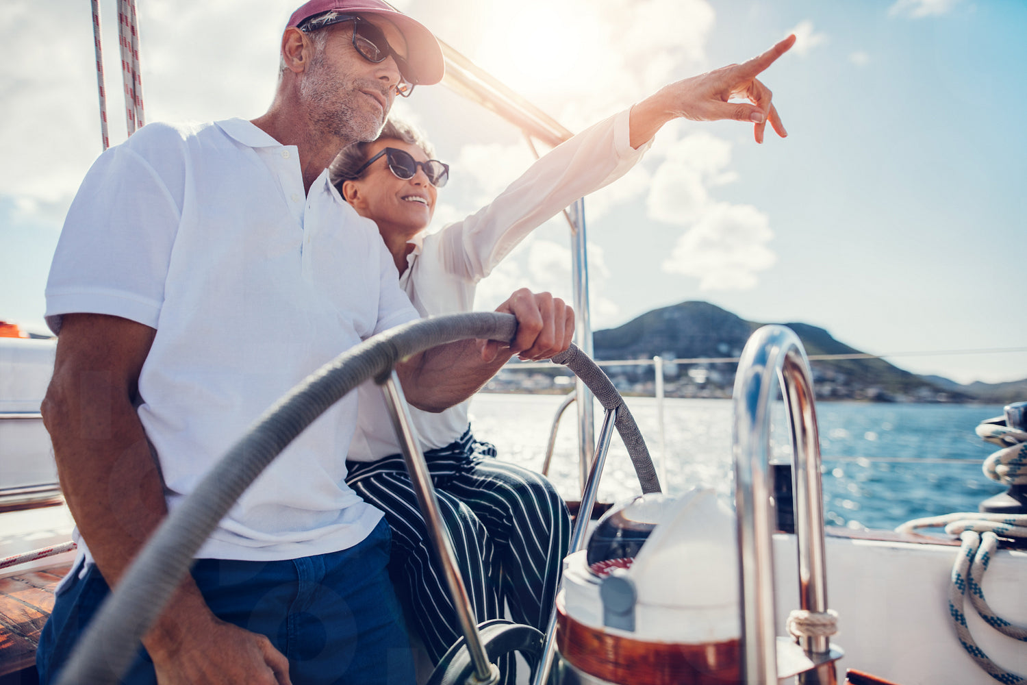 Mature couple staring off into the distance while standing at the wheel of a boat, with woman pointing at a view. Senior man and women sailing.