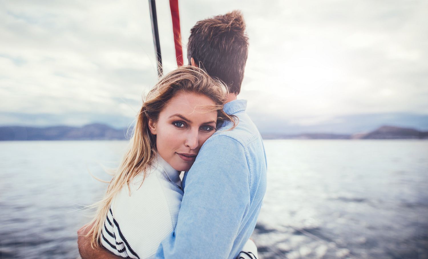 Close up shot of attractive young woman hugging her boyfriend. Loving young couple on a romantic holiday , enjoying on a boat trip.
