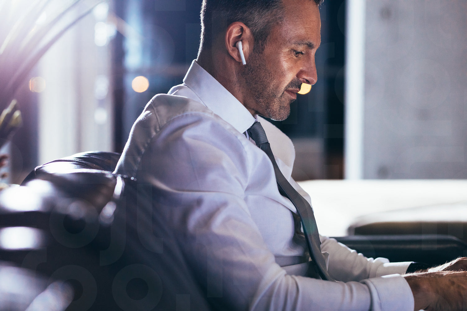 Businessman sitting at airport business lounge, waiting for his flight. Mature male business professional wearing wireless earphones using mobile phone.
