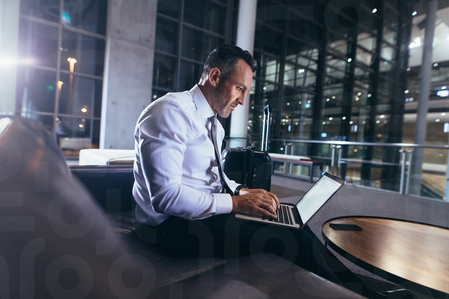 Businessman waiting at the airport using laptop. Man in formalwear sitting at airport departure area using his laptop.
