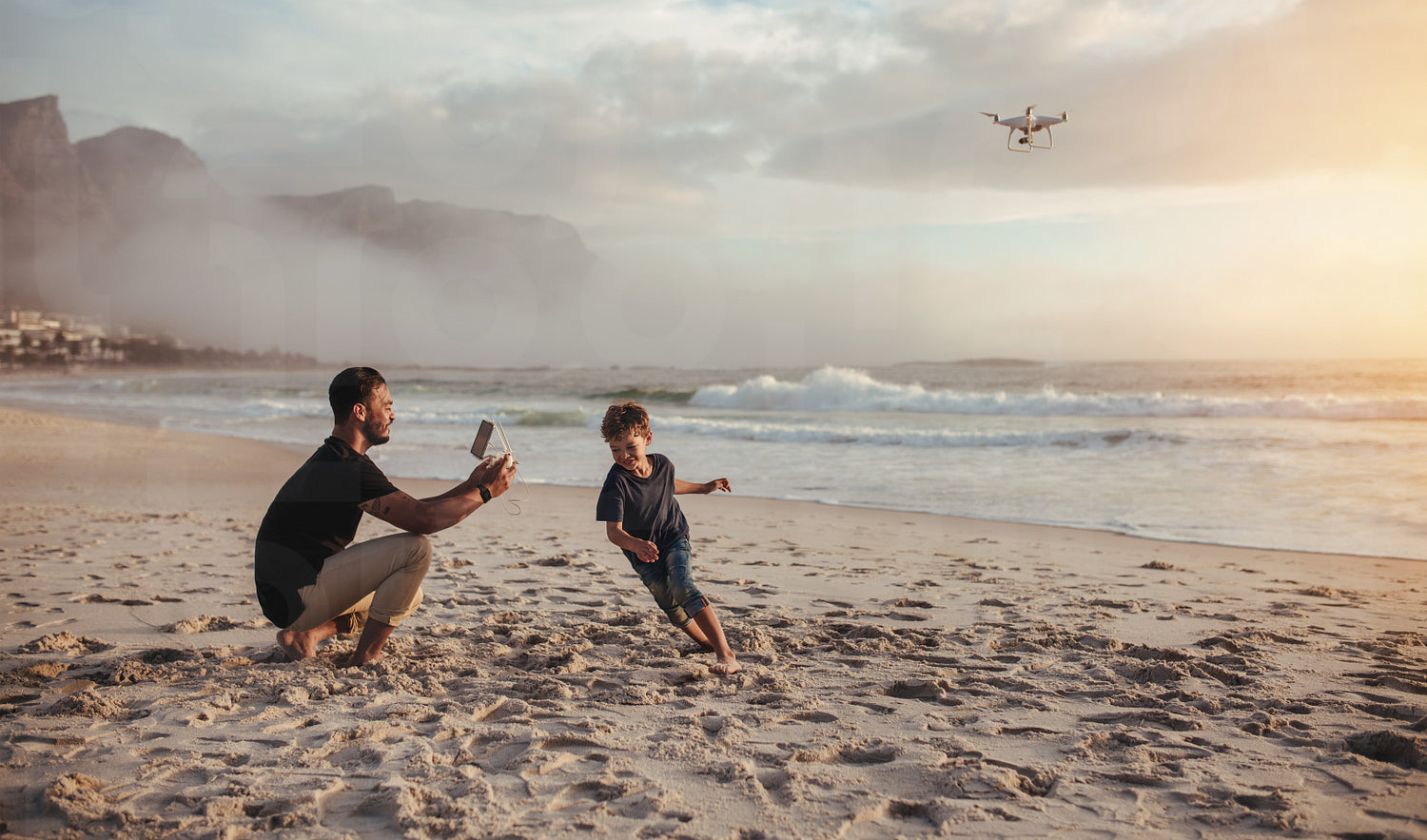 Shot of young father flying drone and son running on beach. Young man flying drone and little boy running on the sandy beach during summer vacation.