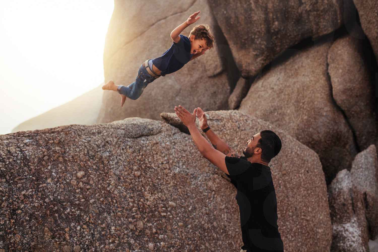 Outdoor shot of little boy leaping into his father's arms from a rock. Father and son having fun on summer holidays at the beach.