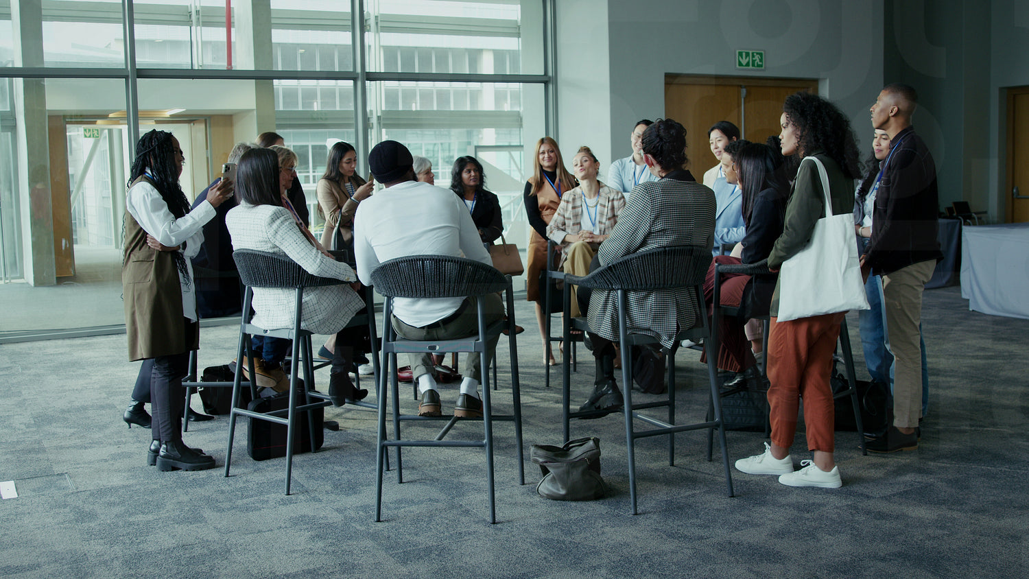 Group of professionals engaging in a collaborative discussion at a large event. Colleagues exchange ideas and network during a conference or workshop session.