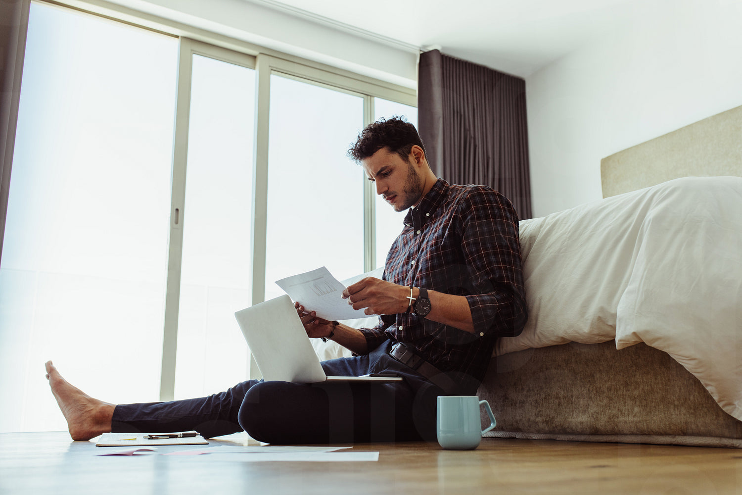 Man working on laptop computer sitting on the floor. Freelancer looking at a paper while working on laptop computer at home.