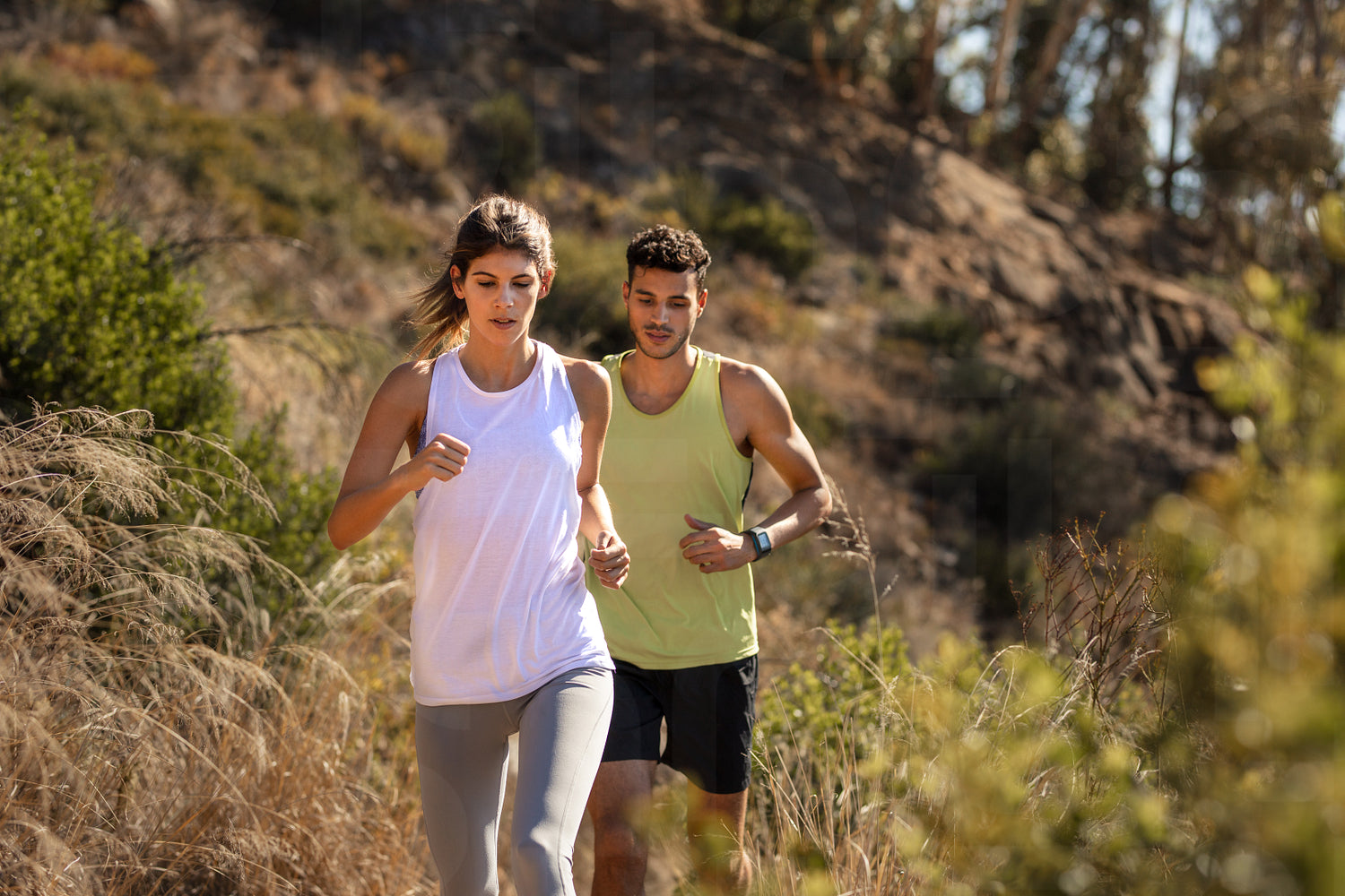 Healthy young couple running on mountain trail in morning. Young man and woman jogging on country path.