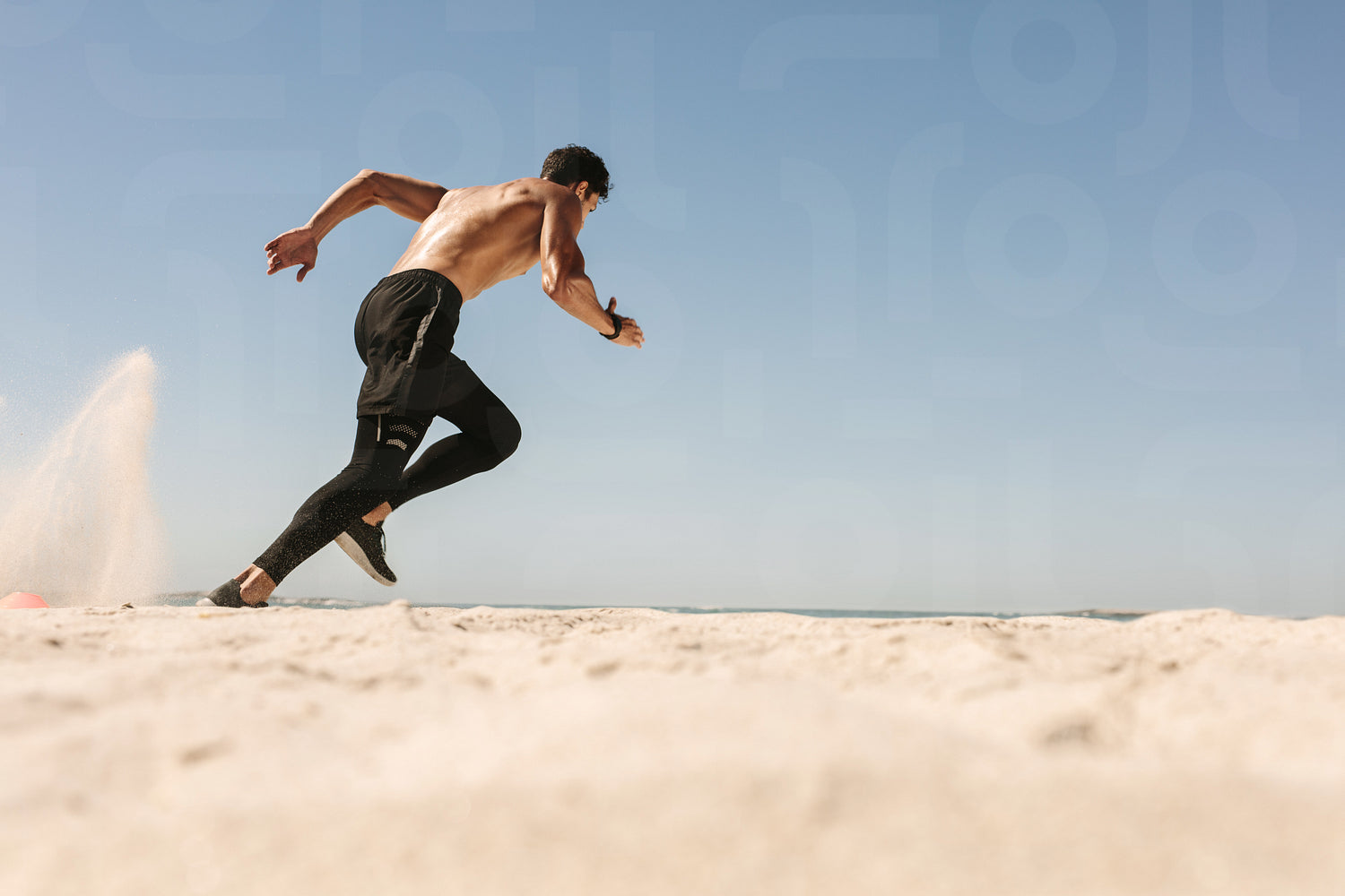 Man doing fitness workout at a beach on a sunny day. Side view of an athletic man running on the beach.