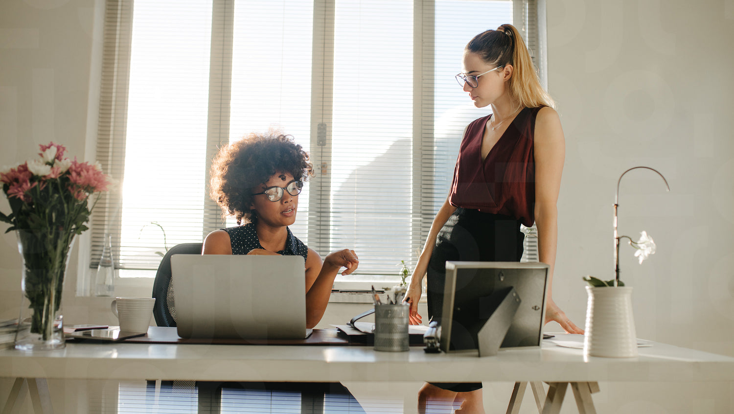 Portrait of two businesswomen discussing work in office. Young women talking about new project in modern office.