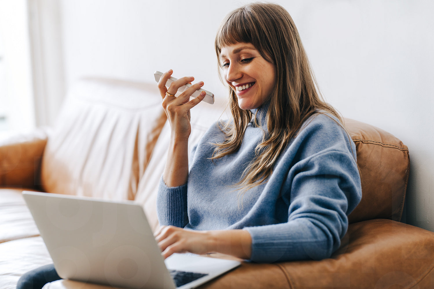 Smiling businesswoman having a phone call discussion while sitting in an office lobby. Young female entrepreneur speaking on the phone while working on a laptop in a modern workplace.