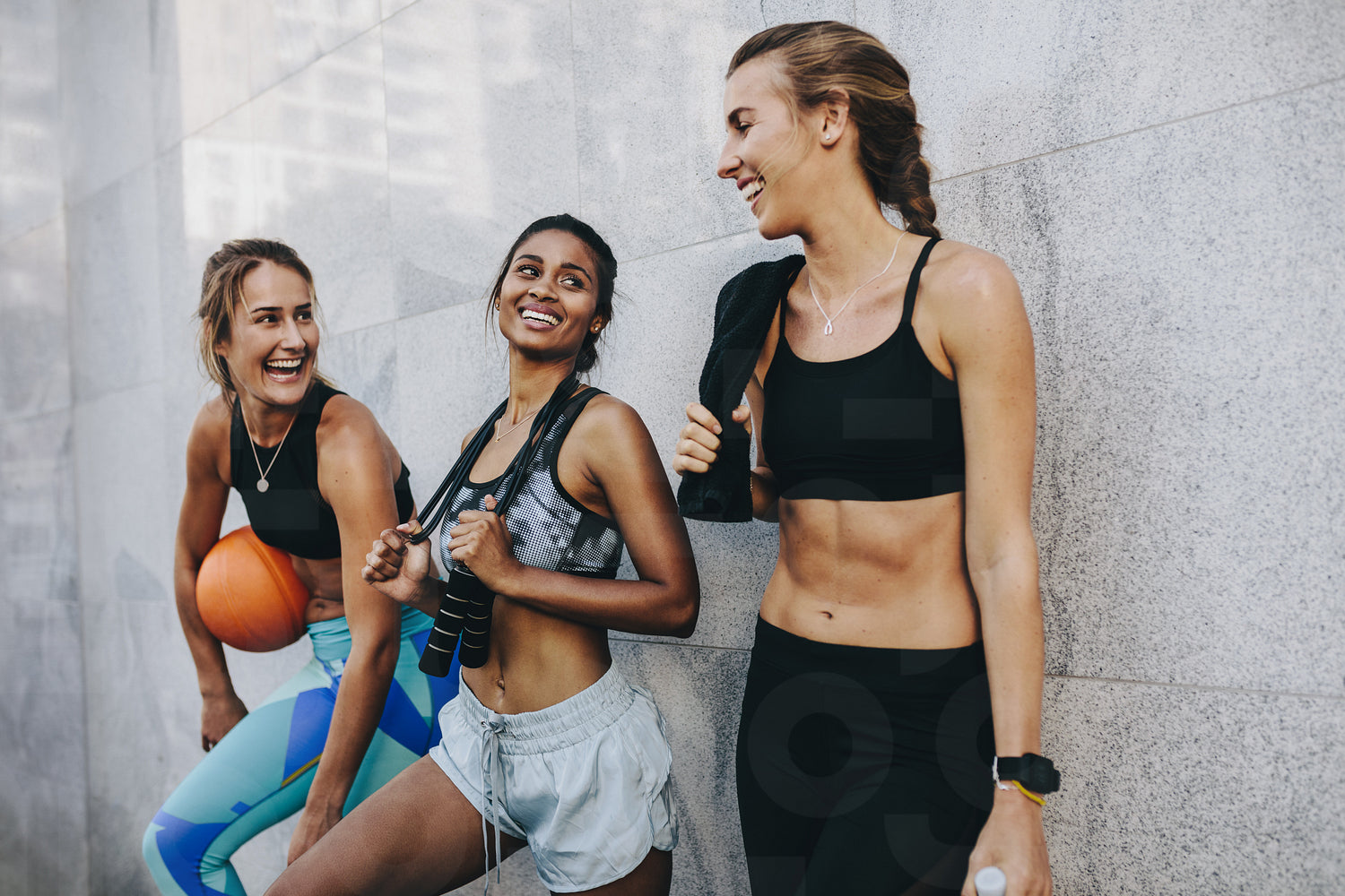 Three women in fitness clothes standing against a wall outdoors talking to each other after workout. Happy fitness women after workout carrying basketball and skipping rope.