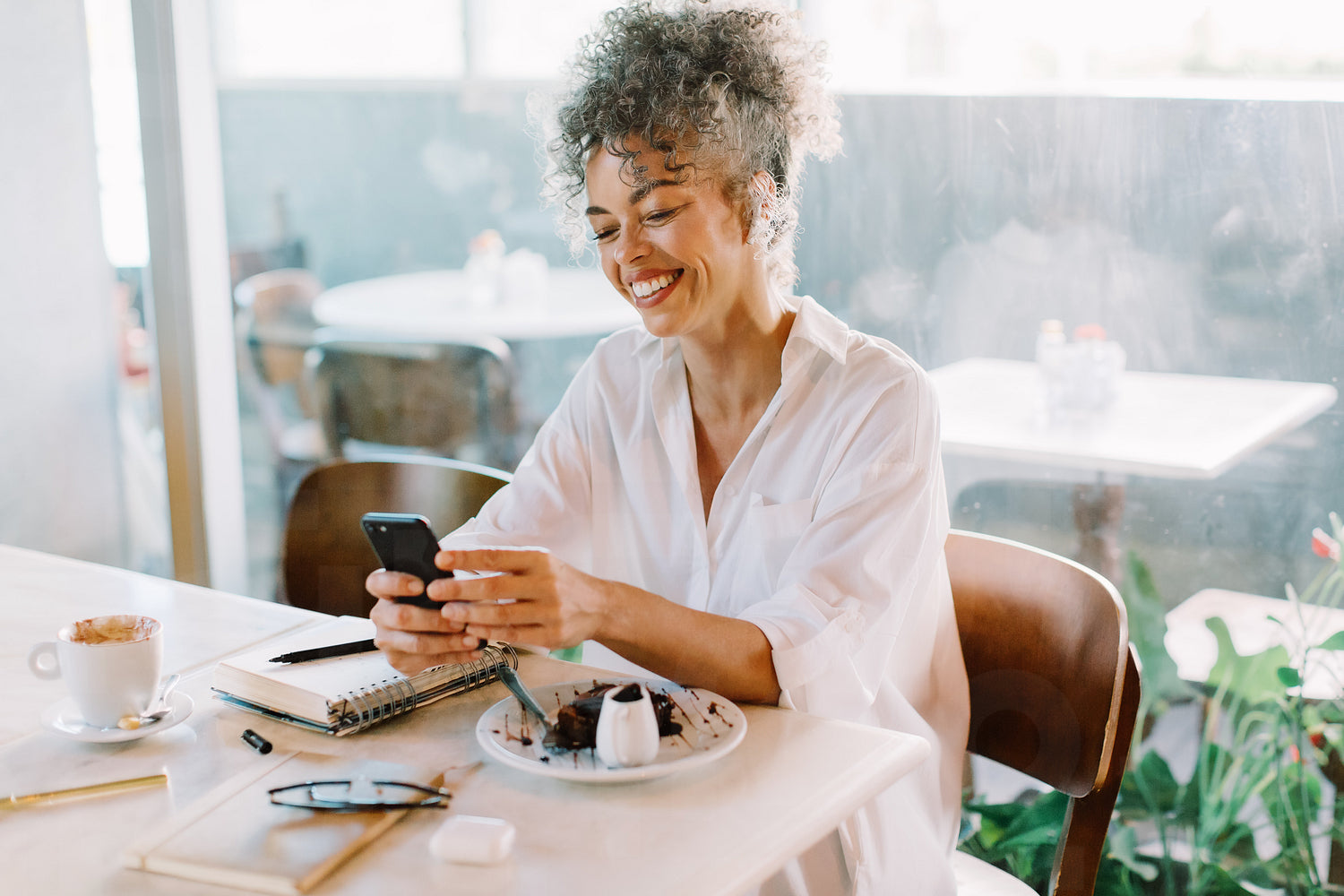 Mature businesswoman talking on a video call in a cafe. Mature businesswoman smiling while speaking with her colleagues on a smartphone. Businesswoman sitting alone at a cafe table.