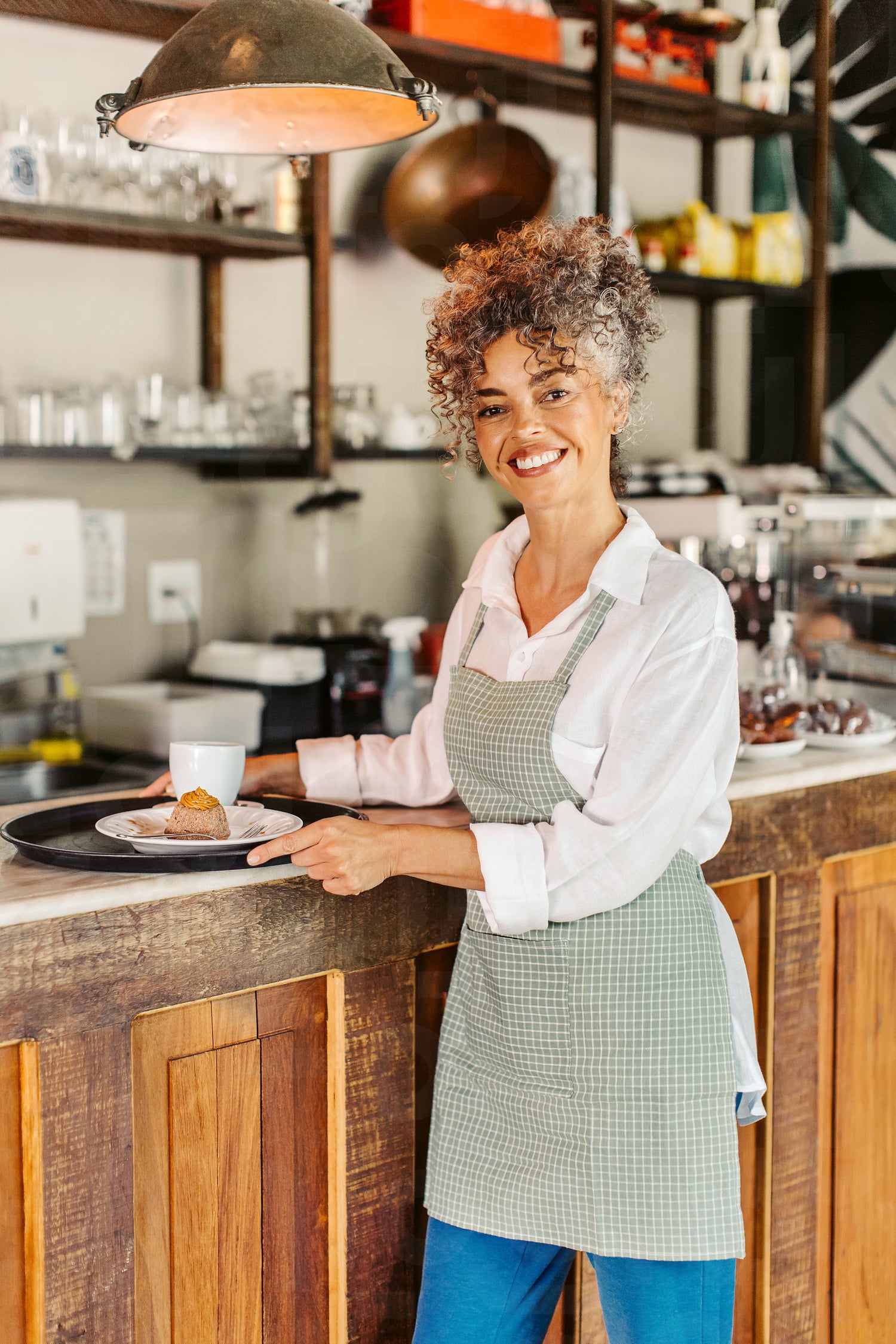Confident cafe owner holding a trey of food in her coffee shop. Mature female barista smiling cheerfully while serving customers in a cafe. Mature business owner working alone.