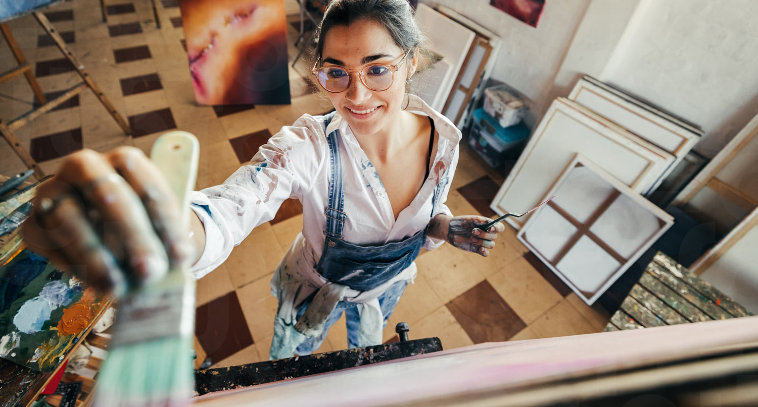 Cheerful artist painting on a canvas in her studio. High angle view of an imaginative young painter smiling while working. Creative female artist making a new artwork for her project.