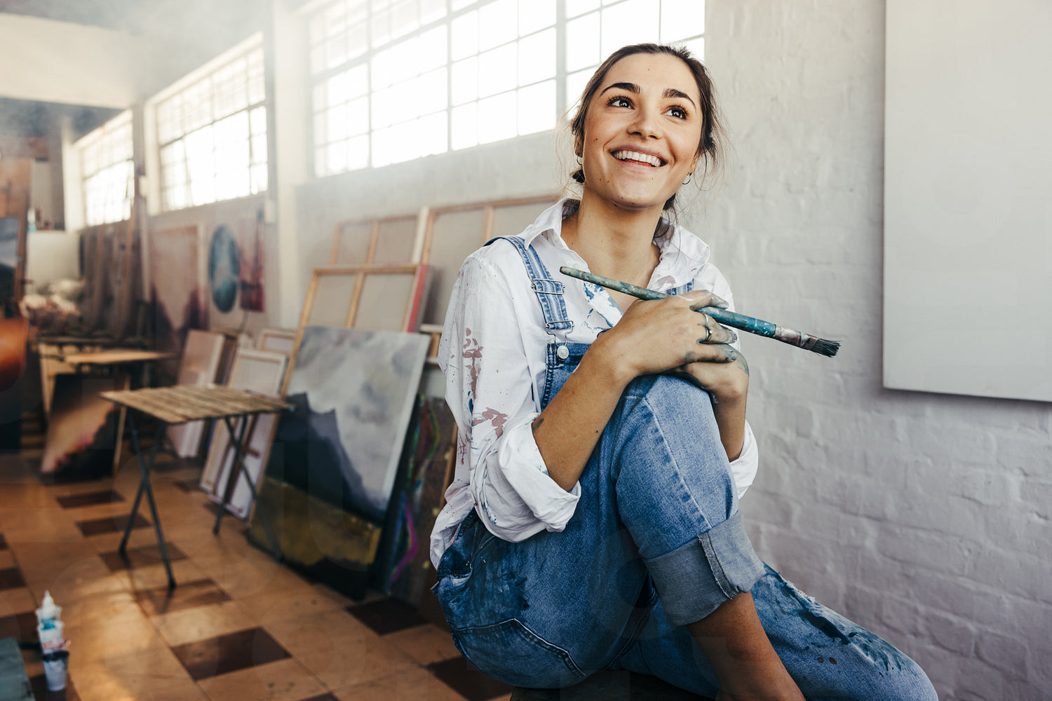 Excited female painter smiling in her art studio. Cheerful young artist holding a paintbrush while sitting in front of a blank canvas. Creative young woman starting a new art project.
