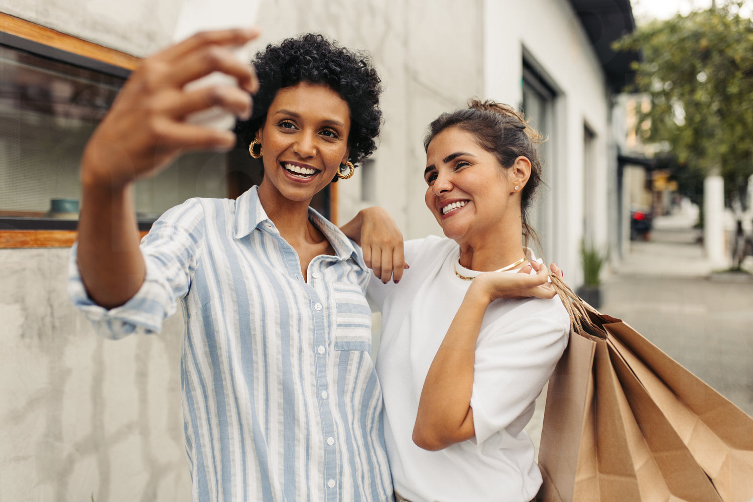 Cheerful young women taking a selfie while standing outdoors with shopping bags. Two happy female friends waiting for their ride to arrive in the city.