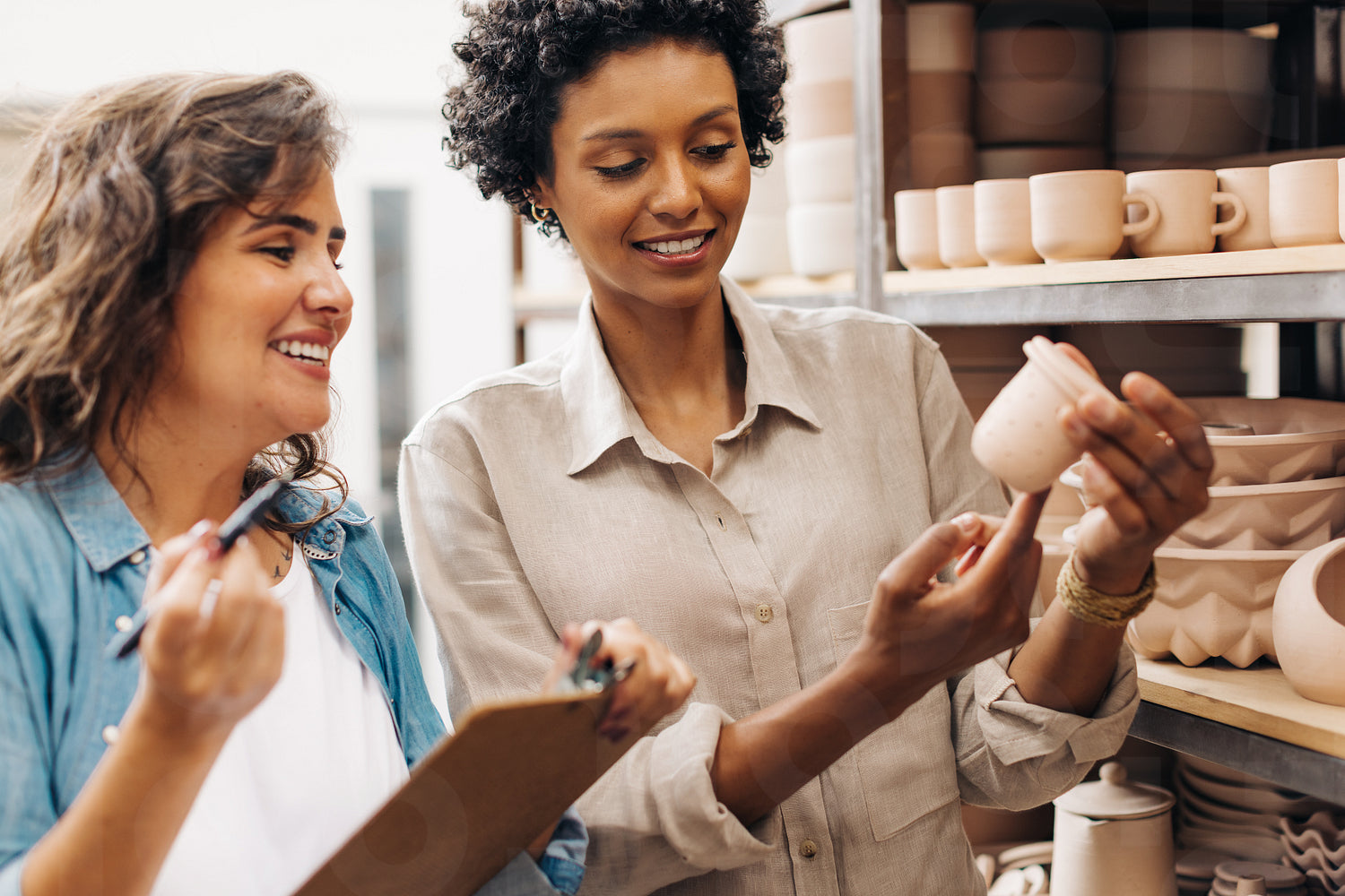 Happy female ceramists discussing about one of their earthenware products. Two businesswomen managing a store with handmade ceramic products. Female entrepreneurs running a creative small business.