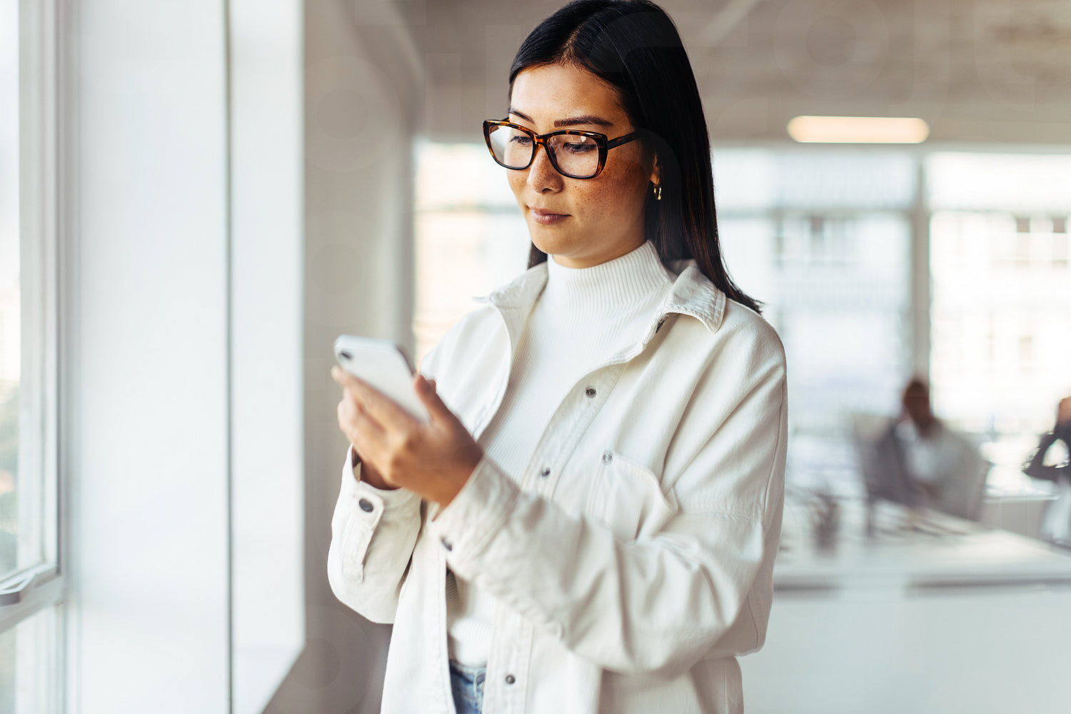 Asian business woman using a mobile phone in her workplace. Female business professional browsing through her text messages while standing in an office.