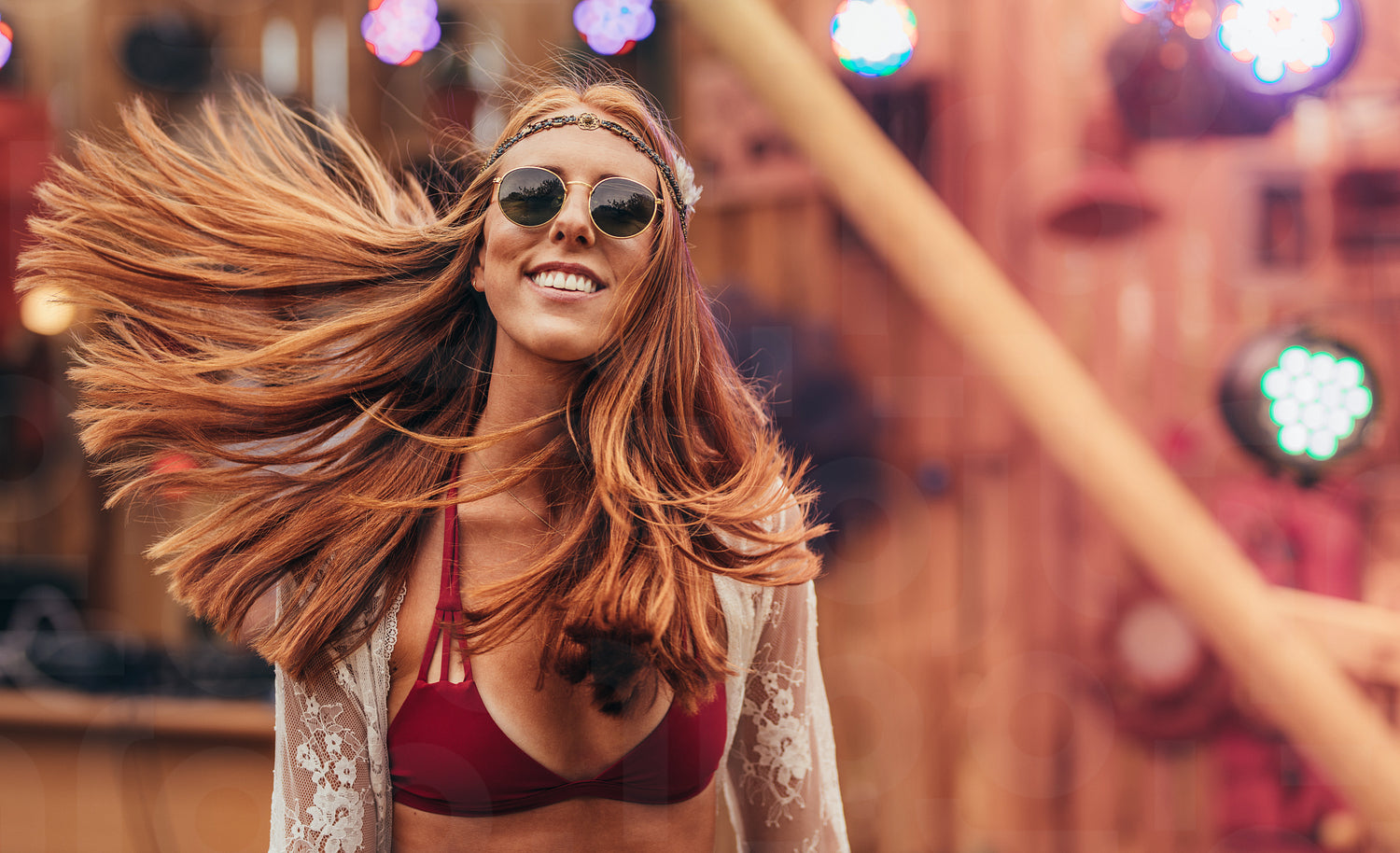Attractive hippie woman at music festival outdoors. Caucasian woman in retro style outfit at music festival.
