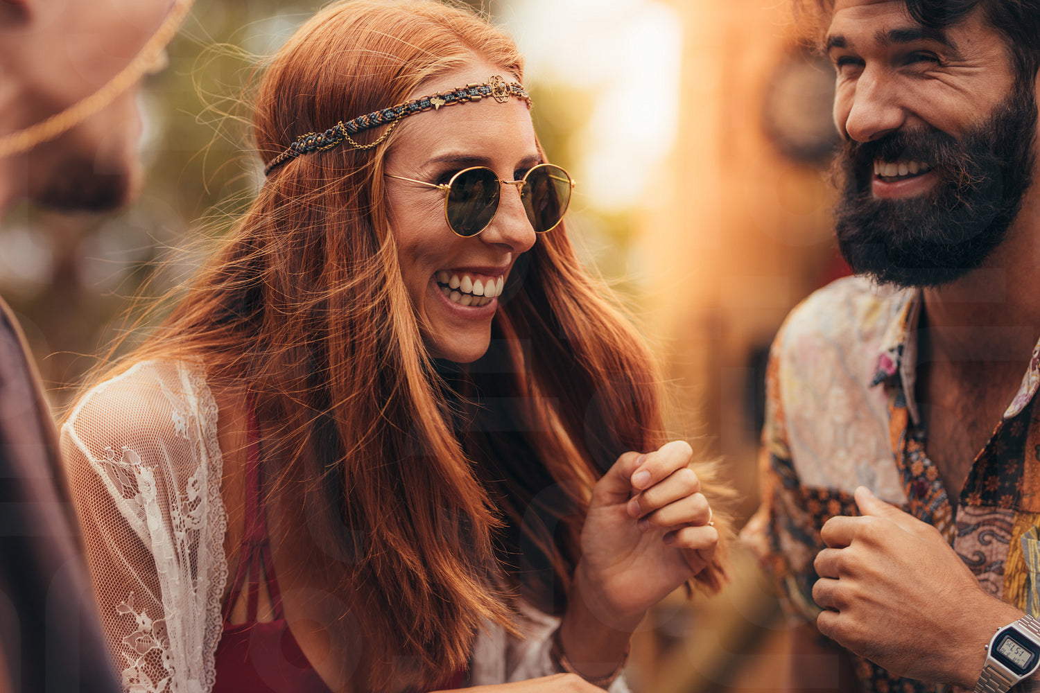 Woman in hippie style dancing and enjoying with friends at music festival. Young people having fun at music festival.