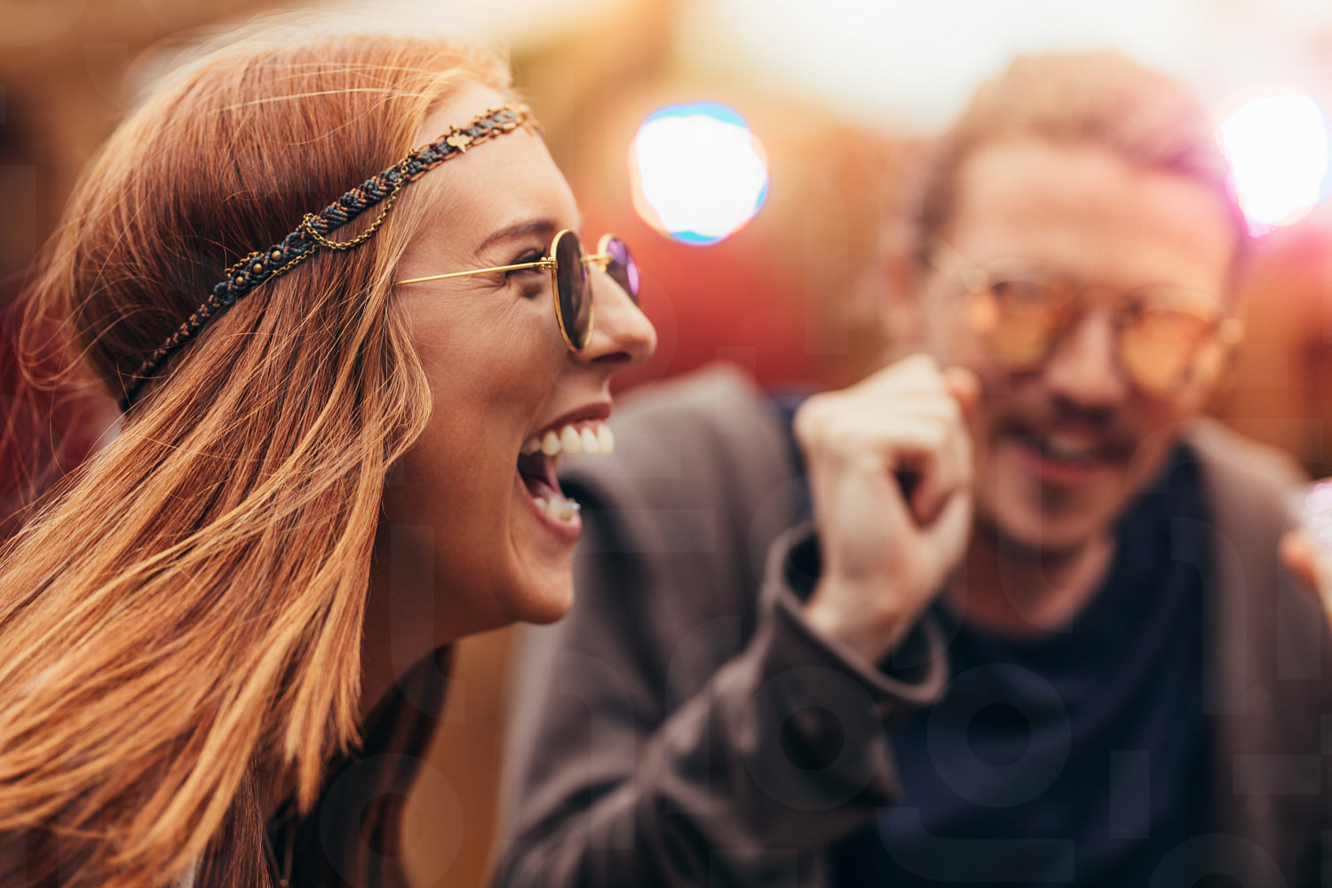 Beautiful woman in hippie style with sunglasses dancing and enjoying with friends at music festival. Young people having fun at music festival.