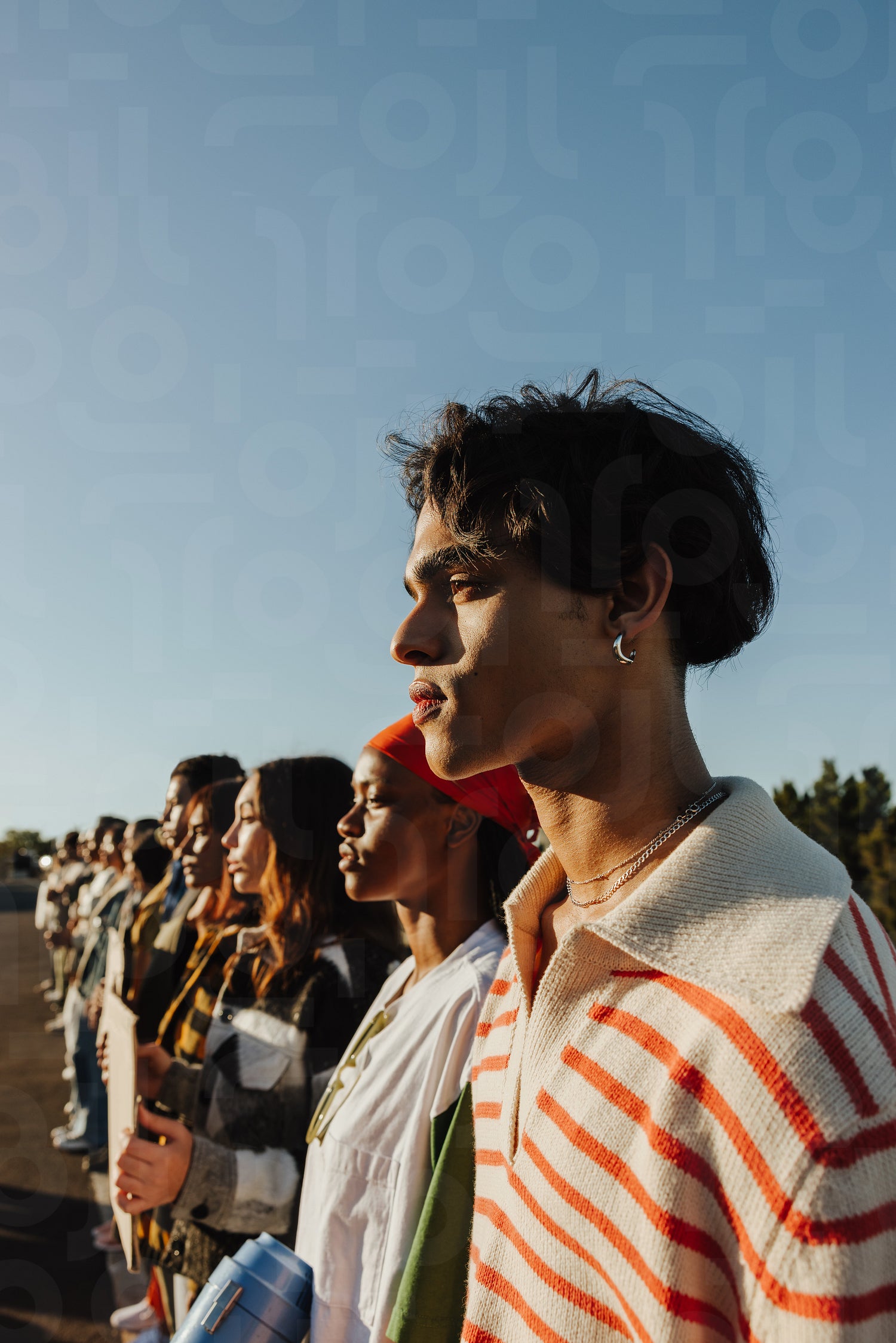 A diverse group of young individuals, both men and women, united and standing in solidarity at a peaceful daytime rally, symbolizing inclusivity and collective purpose amidst outdoor surroundings.