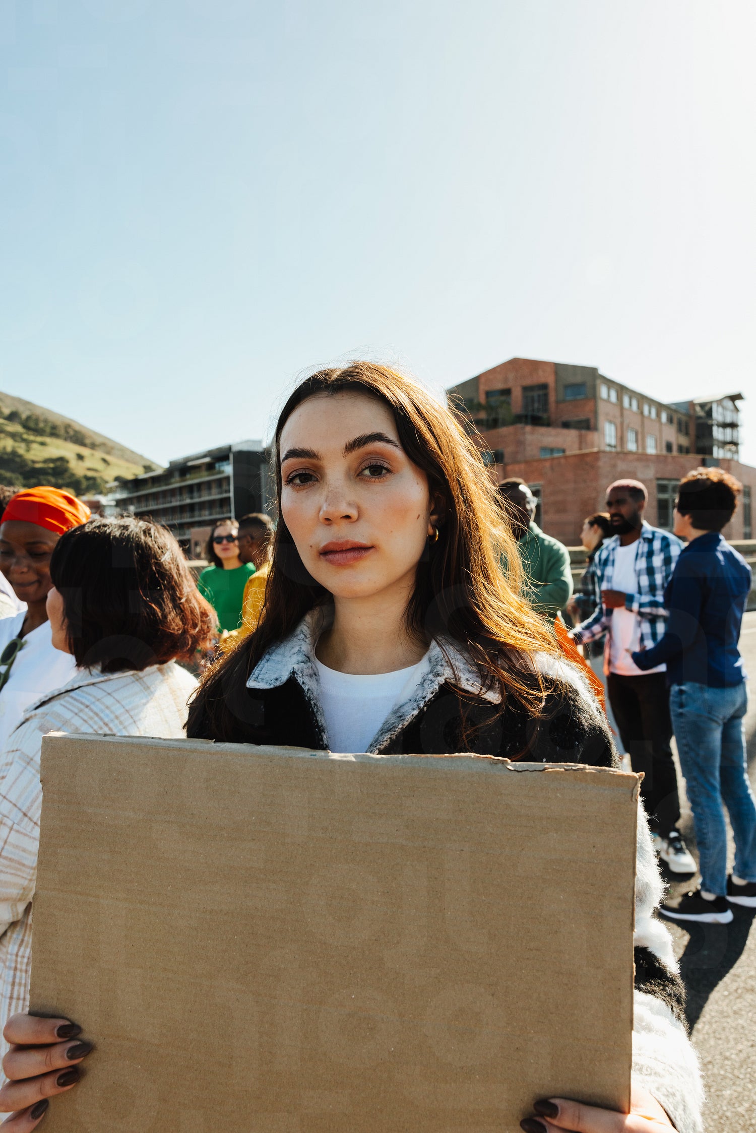 A young woman stands outdoors holding a blank sign, surrounded by a diverse group of people demonstratively gathered on a sunny day, symbolizing activism, solidarity, and collective action.