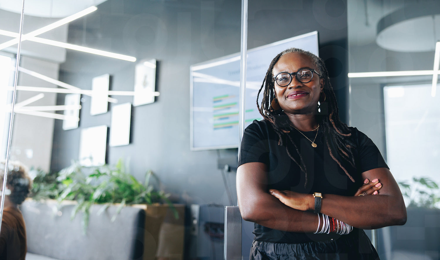 African woman stands outside a conference room in a professional workplace, looking at the camera with a smile and crossed arms. Mature business woman preparing to join her colleagues in a meeting.