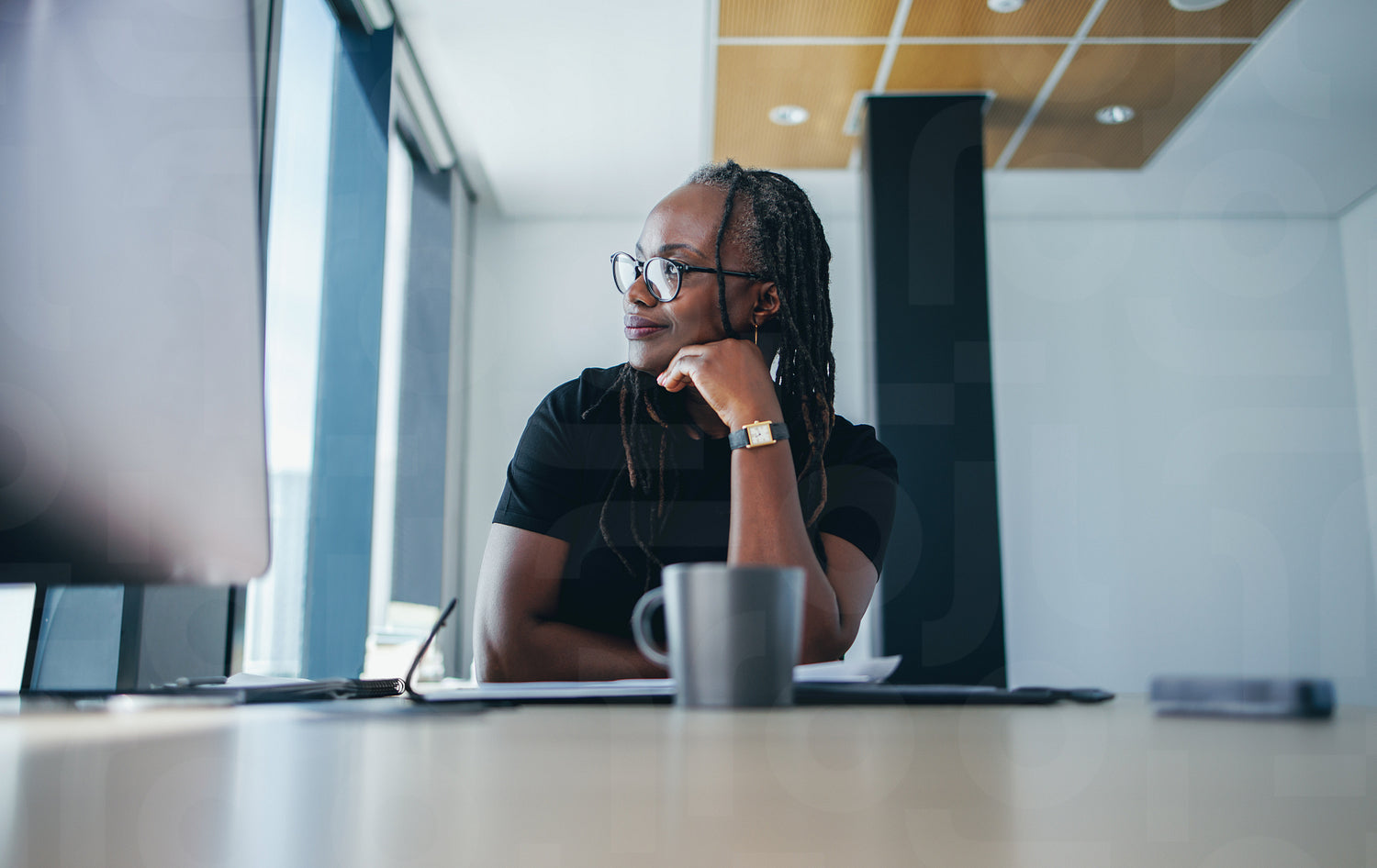 Thoughtful black businesswoman sits at her desk in her office, looking outside her window. Professional woman reflects on an important business matter with a pensive expression.