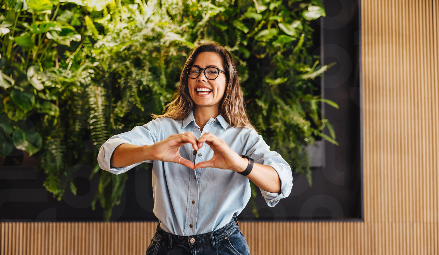 Business woman doing a heart gesture as she stands in a sustainable business office