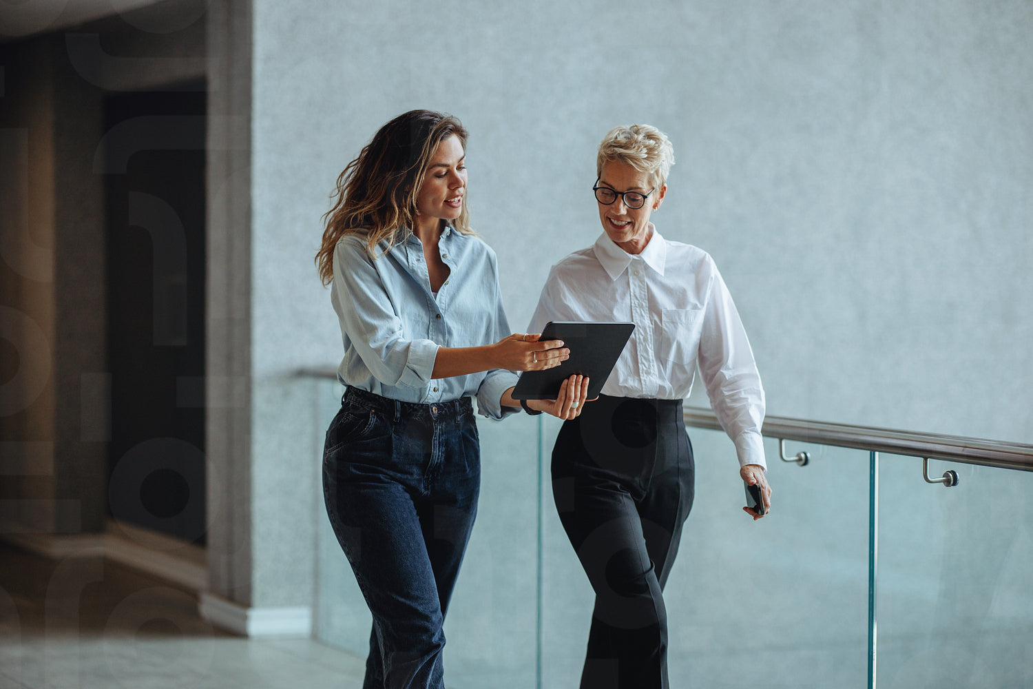 Female executive assistant using a digital tablet to give her boss a briefing on her appointments and meetings in the morning. Business women discussing their busy schedule in a corporate office.