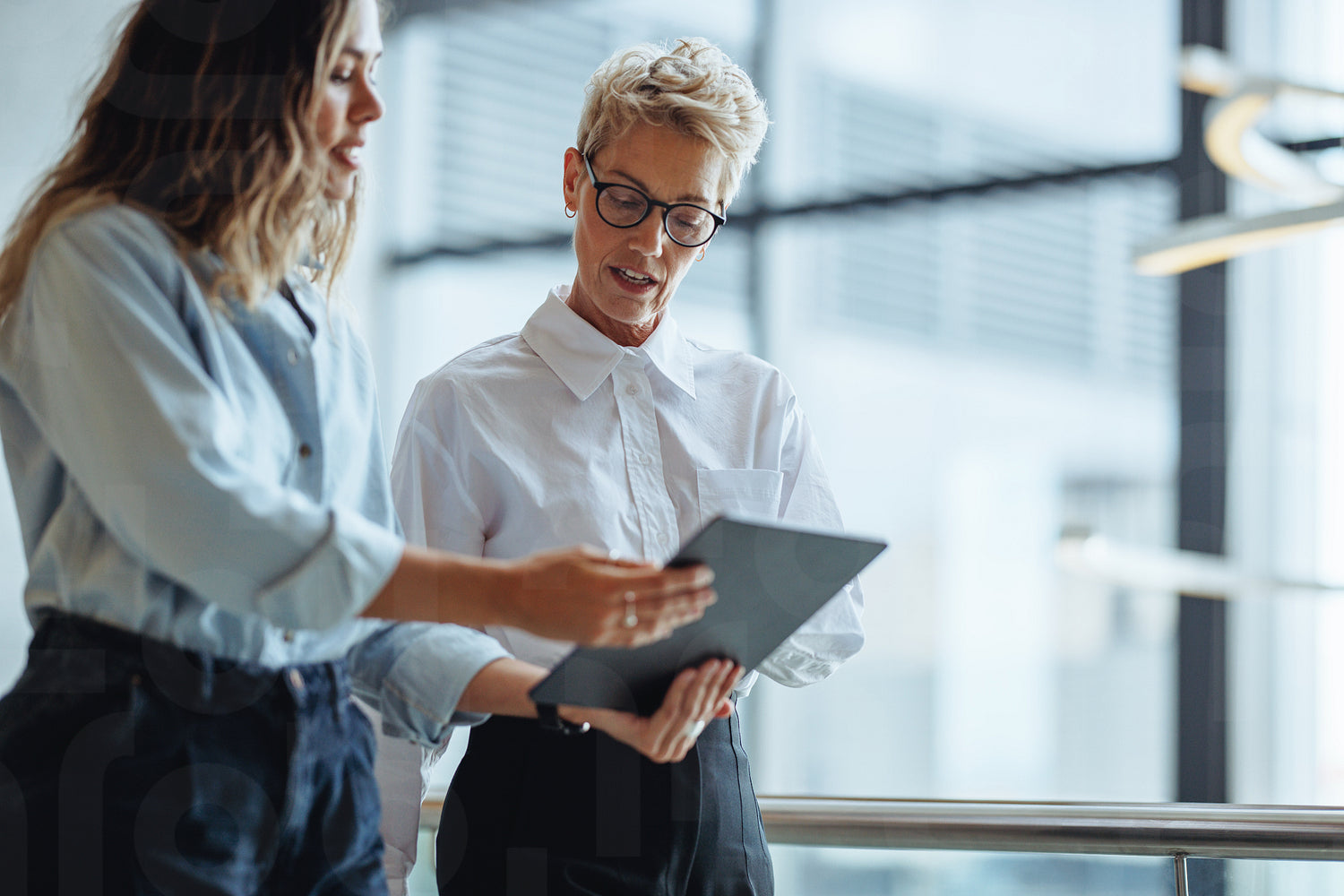 Female business executive using a tablet with her personal assistant as they discuss their meetings and appointments for the day. Two business women having a morning briefing in a busy corporate office.