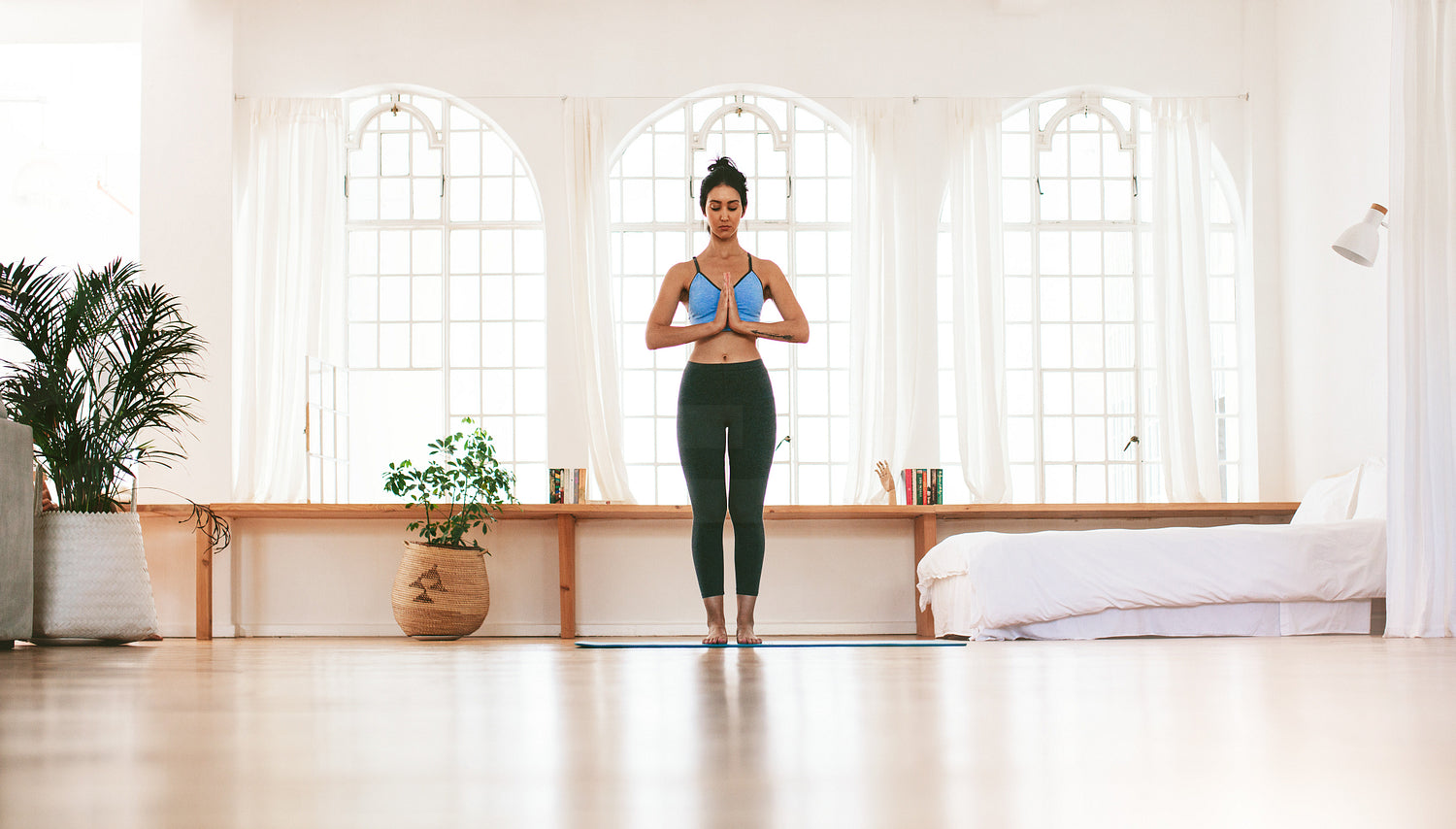 Full length portrait of fit young woman standing with her hands joined at home. Fitness female meditating indoors.