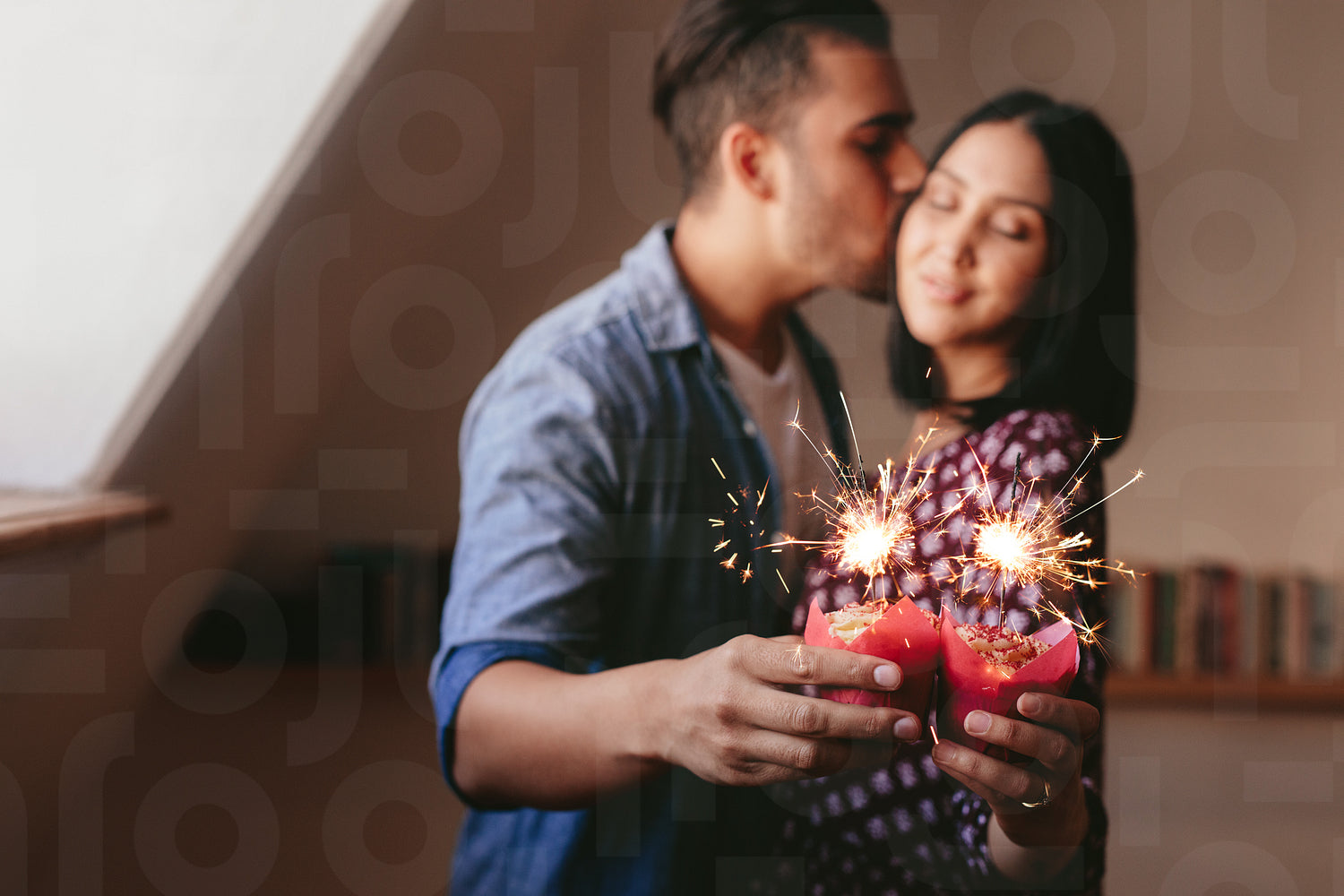 Sparklers on cupcakes in hand of couple. Man kissing with his girlfriend at home. Romantic young couple celebrating their anniversary.