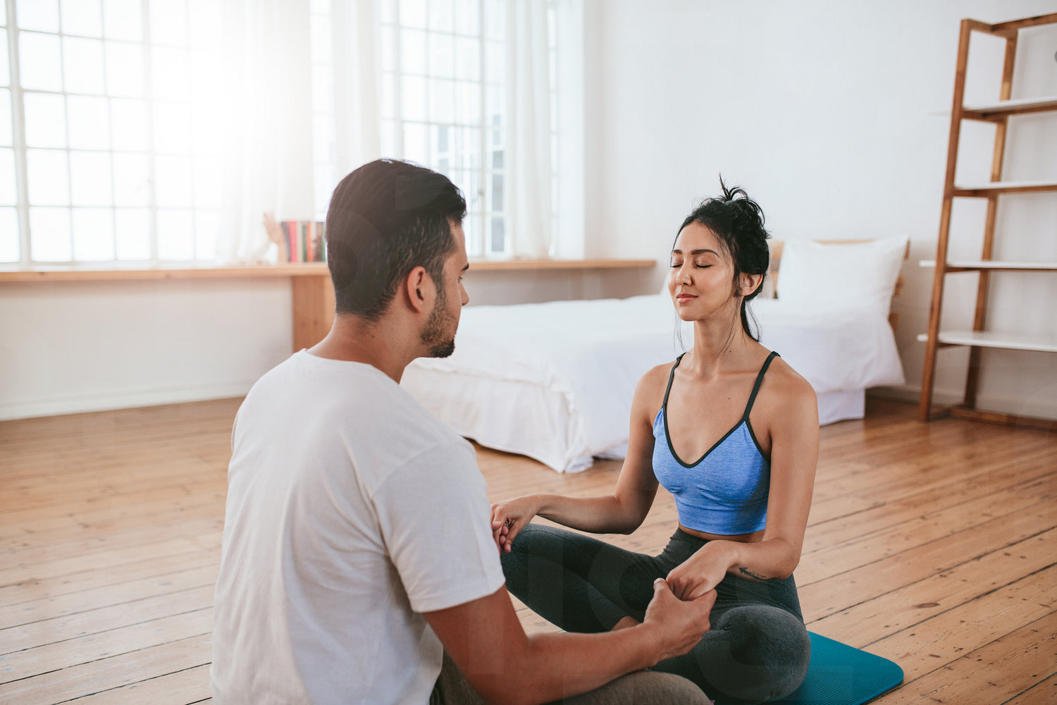 Beautiful couple in sitting together holding hands at home and meditating. Young man and woman doing yoga together at home.